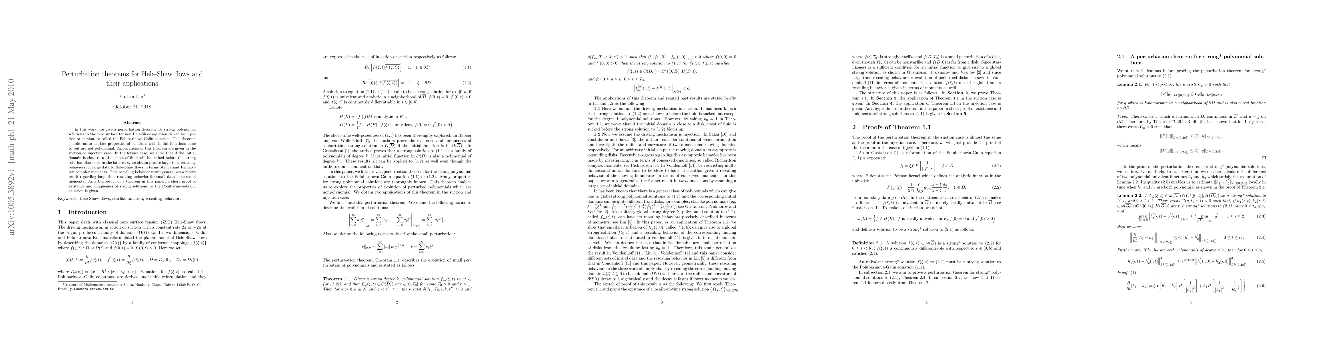 This paper presents a perturbation theorem for strong polynomial solutions to the Hele-Shaw equation, enabling analysis of solutions with initial conditions close to but not strictly polynomial. Applications include showing that fluid will mostly be sucked out before strong solutions blow up for initial domains close to disks, and deriving large-time rescaling behaviors for large data in terms of invariant Richardson complex moments.