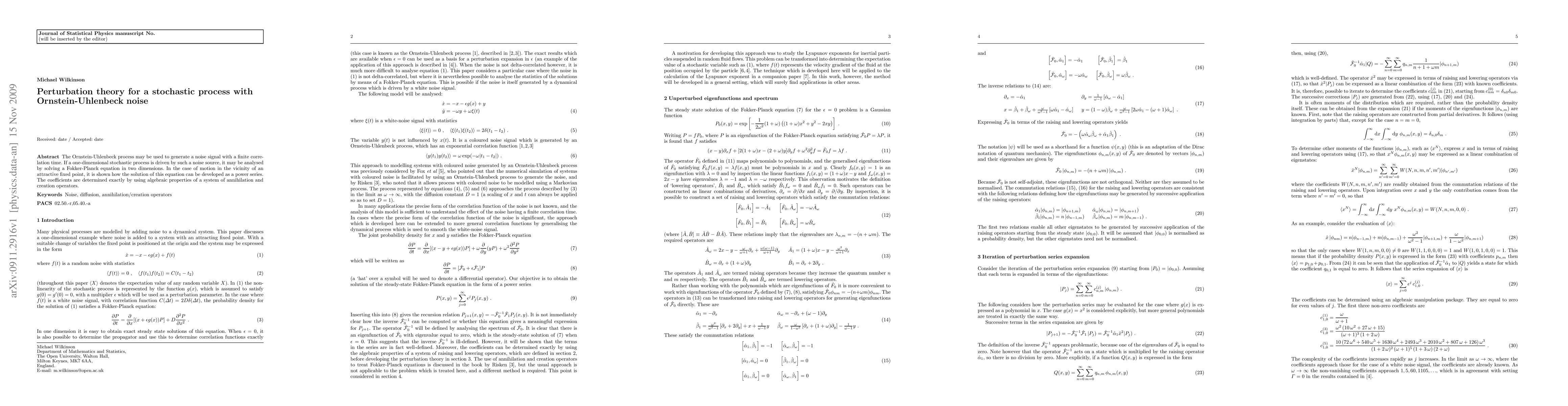 This paper develops a perturbation theory for a stochastic process driven by Ornstein-Uhlenbeck noise, solving a Fokker-Planck equation to analyze motion near an attractive fixed point. The solution is expressed as a power series with coefficients determined using algebraic properties of annihilation and creation operators.