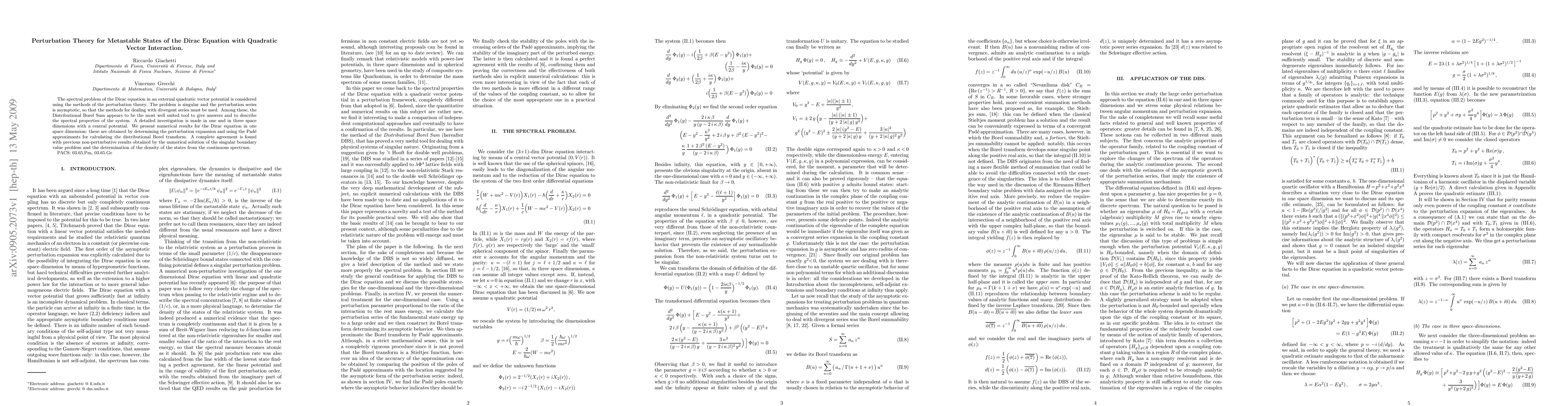 The spectral problem of the Dirac equation in an external quadratic vector potential is considered using the methods of the perturbation theory. The problem is singular and the perturbation series is asymptotic, so that the methods for dealing with divergent series must be used. Among these, the Distributional Borel Sum appears to be the most well suited tool to give answers and to describe the spectral properties of the system. A detailed investigation is made in one and in three space dimensions with a central potential. We present numerical results for the Dirac equation in one space dimension: these are obtained by determining the perturbation expansion and using the Pad\'e approximants for calculating the distributional Borel transform. A complete agreement is found with previous non-perturbative results obtained by the numerical solution of the singular boundary value problem and the determination of the density of the states from the continuous spectrum.