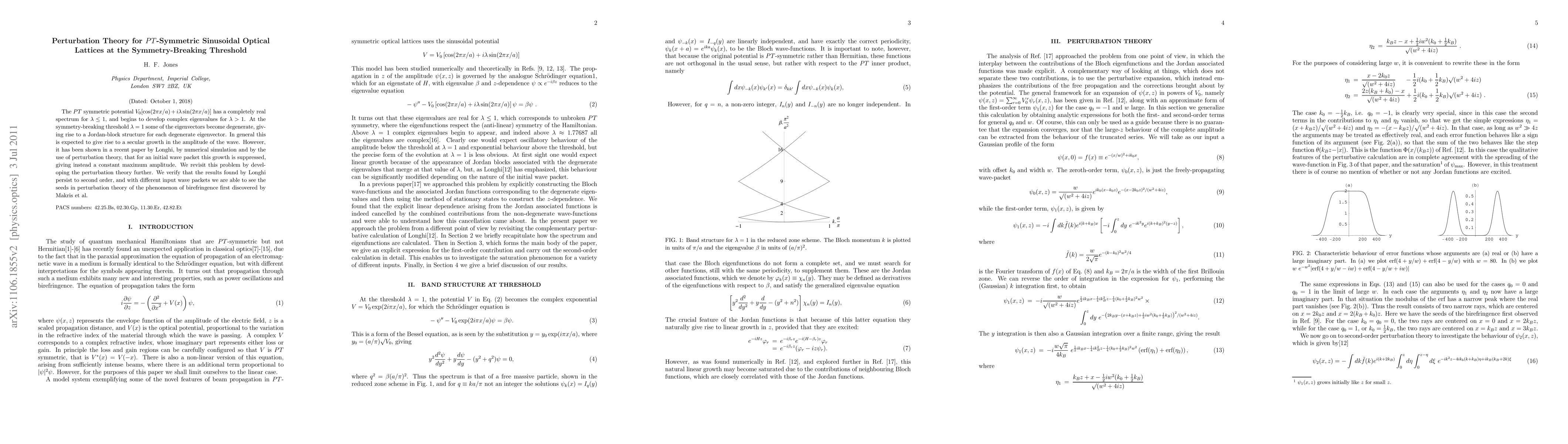 The $PT$ symmetric potential $V_0[\cos(2\pi x/a)+i\lambda\sin(2\pi x/a)]$ has a completely real spectrum for $\lambda\le 1$, and begins to develop complex eigenvalues for $\lambda>1$. At the symmetry-breaking threshold $\lambda=1$ some of the eigenvectors become degenerate, giving rise to a Jordan-block structure for each degenerate eigenvector. In general this is expected to give rise to a secular growth in the amplitude of the wave. However, it has been shown in a recent paper by Longhi, by numerical simulation and by the use of perturbation theory, that for an initial wave packet this growth is suppressed, giving instead a constant maximum amplitude. We revisit this problem by developing the perturbation theory further. We verify that the results found by Longhi persist to second order, and with different input wave packets we are able to see the seeds in perturbation theory of the phenomenon of birefringence first discovered by Makris et al.