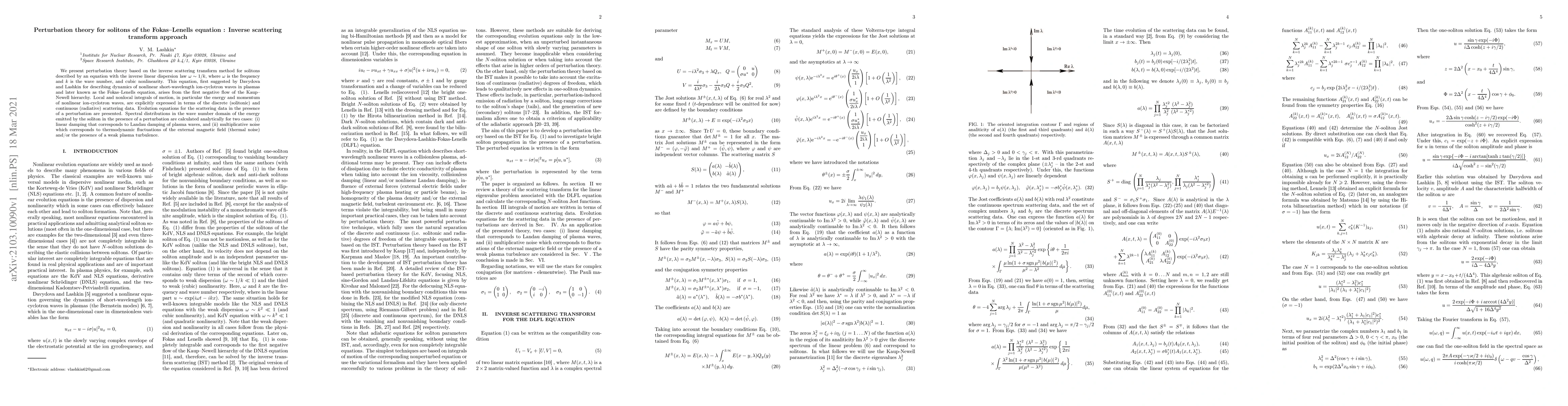 We present perturbation theory based on the inverse scattering transform method for solitons described by an equation with the inverse linear dispersion law $\omega\sim 1/k$, where $\omega$ is the frequency and $k$ is the wave number, and cubic nonlinearity. This equation, first suggested by Davydova and Lashkin for describing dynamics of nonlinear short-wavelength ion-cyclotron waves in plasmas and later known as the Fokas--Lenells equation, arises from the first negative flow of the Kaup--Newell hierarchy. Local and nonlocal integrals of motion, in particular the energy and momentum of nonlinear ion-cyclotron waves, are explicitly expressed in terms of the discrete (solitonic) and continuous (radiative) scattering data. Evolution equations for the scattering data in the presence of a perturbation are presented. Spectral distributions in the wave number domain of the energy emitted by the soliton in the presence of a perturbation are calculated analytically for two cases: (i) linear damping that corresponds to Landau damping of plasma waves, and (ii) multiplicative noise which corresponds to thermodynamic fluctuations of the external magnetic field (thermal noise) and/or the presence of a weak plasma turbulence.