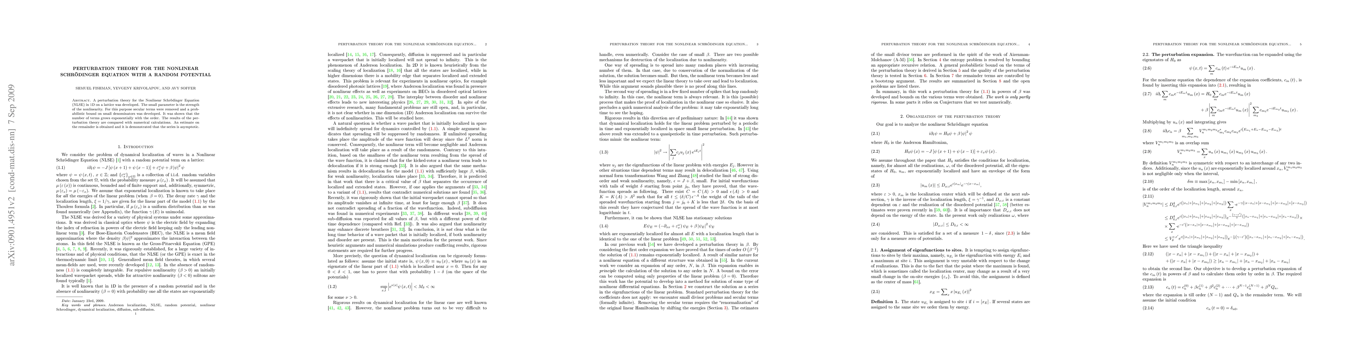 This paper develops a perturbation theory for the 1D Nonlinear Schroedinger Equation on a lattice with a random potential, focusing on the strength of nonlinearity as the small parameter. It removes secular terms and provides a probabilistic bound on small denominators, showing exponential growth in the number of terms with order, and demonstrates the asymptotic nature of the series through numerical comparisons and remainder estimates.