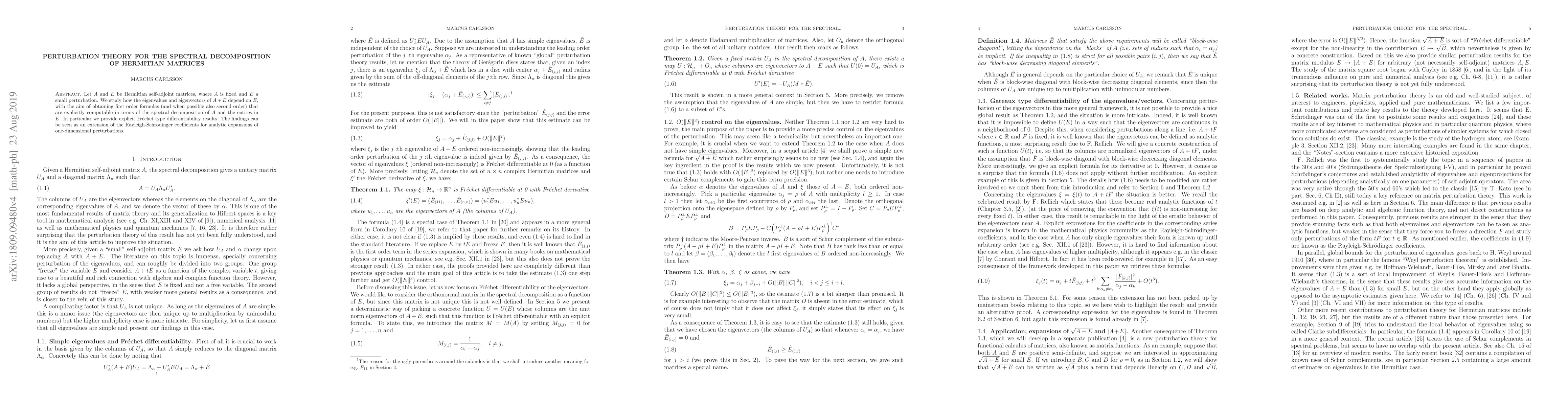 Researchers developed perturbation theory to study how eigenvalues and eigenvectors of Hermitian matrices change with small perturbations, aiming to provide explicit formulas for the spectral decomposition and Frechet differentiability results.