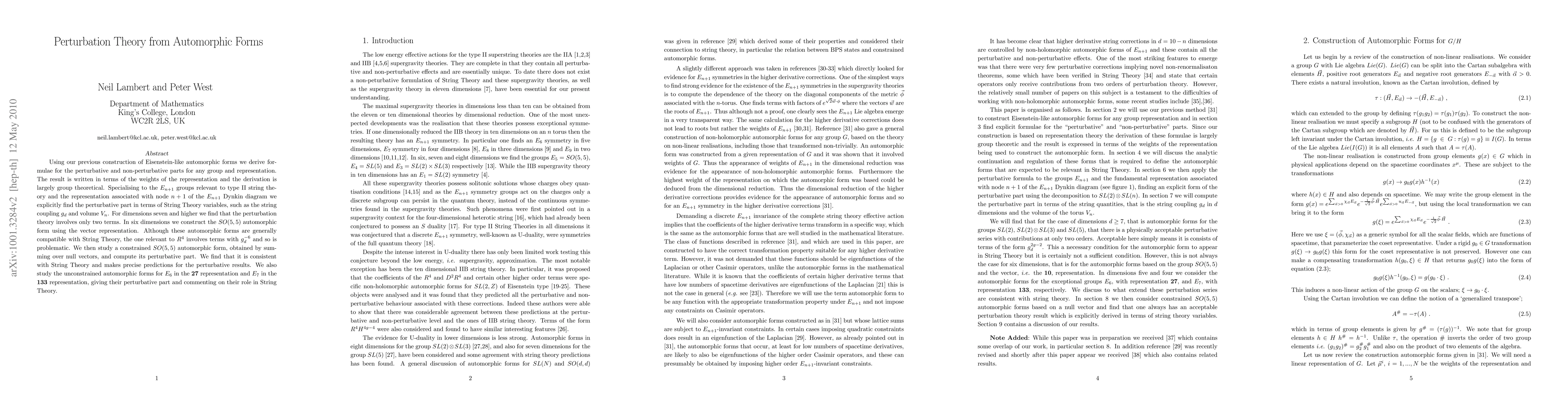This paper develops perturbation theory using Eisenstein-like automorphic forms for various groups and representations, deriving explicit formulae for the perturbative parts in terms of String Theory variables. It finds that for dimensions seven and higher, perturbation theory involves only two terms, while in six dimensions, a constrained SO(5,5) automorphic form is consistent with String Theory, unlike the unconstrained form.