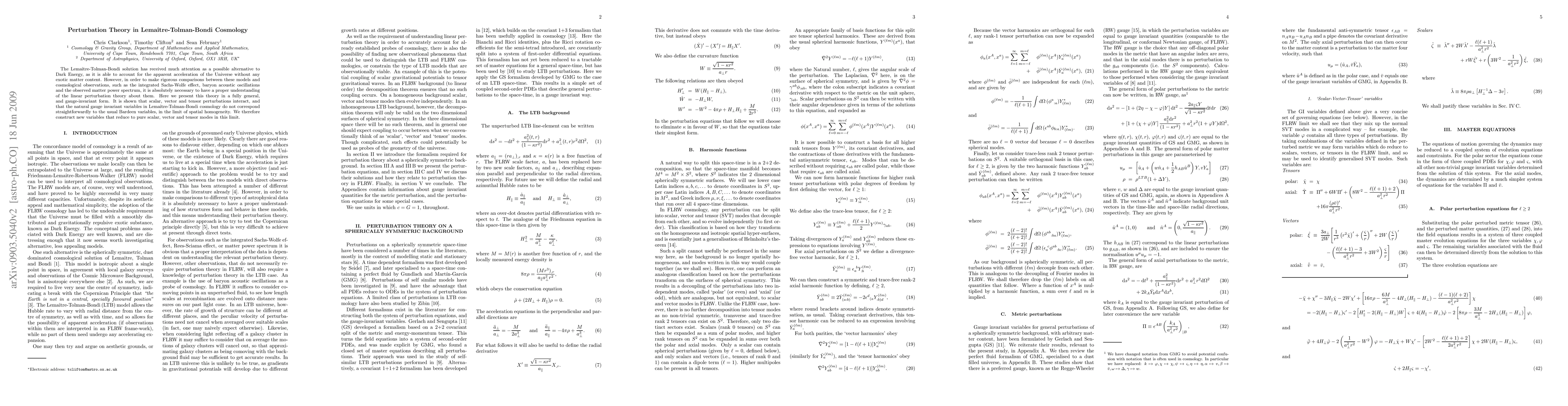 The Lemaitre-Tolman-Bondi solution has received much attention as a possible alternative to Dark Energy, as it is able to account for the apparent acceleration of the Universe without any exotic matter content. However, in order to make rigorous comparisons between these models and cosmological observations, such as the integrated Sachs-Wolfe effect, baryon acoustic oscillations and the observed matter power spectrum, it is absolutely necessary to have a proper understanding of the linear perturbation theory about them. Here we present this theory in a fully general, and gauge-invariant form. It is shown that scalar, vector and tensor perturbations interact, and that the natural gauge invariant variables in Lemaitre-Tolman-Bondi cosmology do not correspond straightforwardly to the usual Bardeen variables, in the limit of spatial homogeneity. We therefore construct new variables that reduce to pure scalar, vector and tensor modes in this limit.