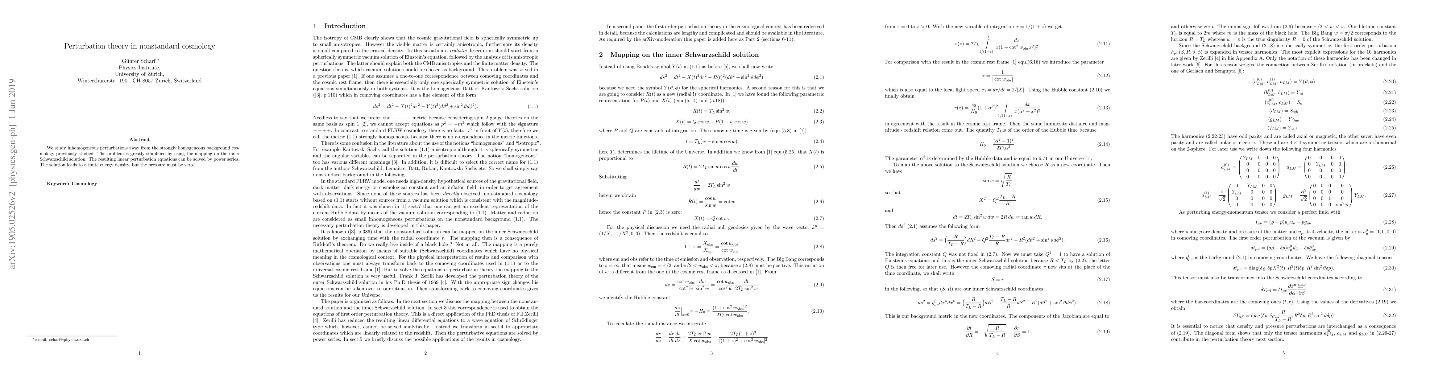 Researchers developed a new approach to studying inhomogeneous perturbations in nonstandard cosmology using the Schwarzschild solution, finding that pressure must be zero for finite energy density.