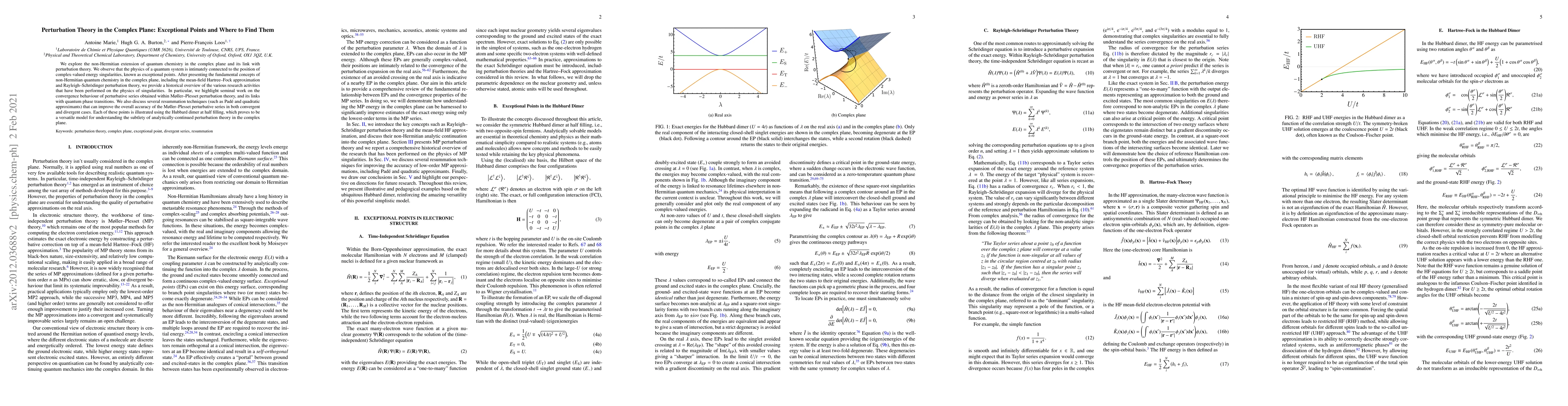 This paper explores non-Hermitian quantum chemistry in the complex plane, focusing on the role of exceptional points and their connection to perturbation theory. It discusses resummation techniques to improve the accuracy of M{\o}ller--Plesset perturbation theory, illustrated using the Hubbard dimer model.