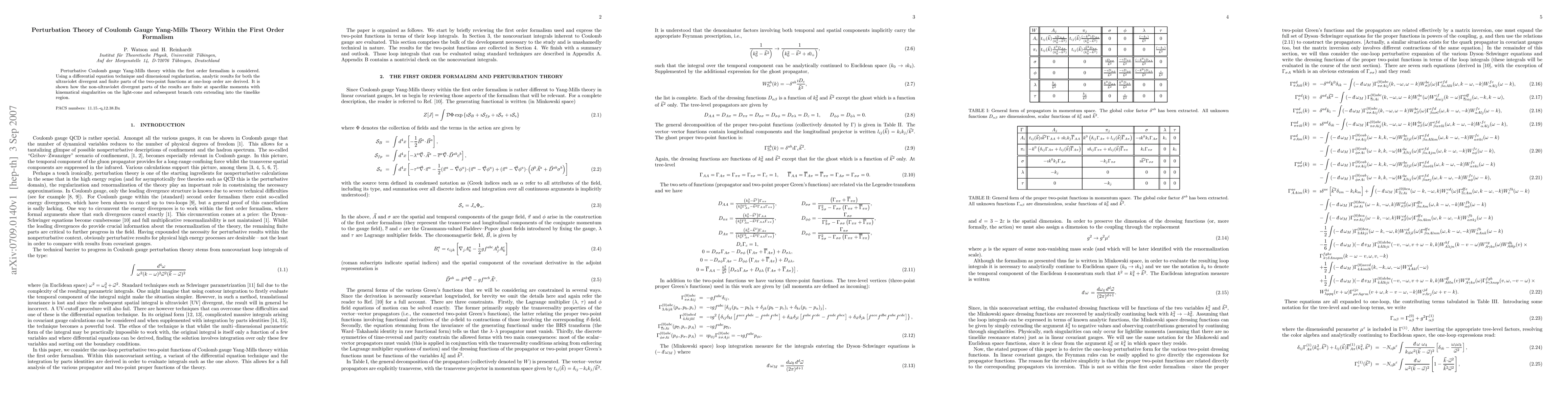Perturbative Coulomb gauge Yang-Mills theory within the first order formalism is considered. Using a differential equation technique and dimensional regularization, analytic results for both the ultraviolet divergent and finite parts of the two-point functions at one-loop order are derived. It is shown how the non-ultraviolet divergent parts of the results are finite at spacelike momenta with kinematical singularities on the light-cone and subsequent branch cuts extending into the timelike region.