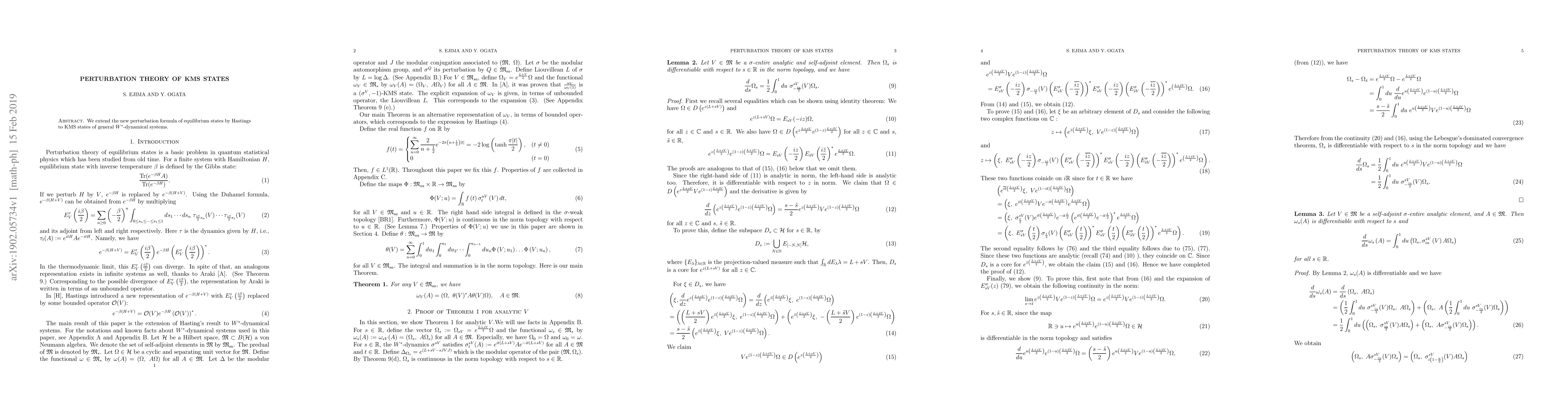 We extend the new perturbation formula of equilibrium states by Hastings to KMS states of general $W^*$-dynamical systems.