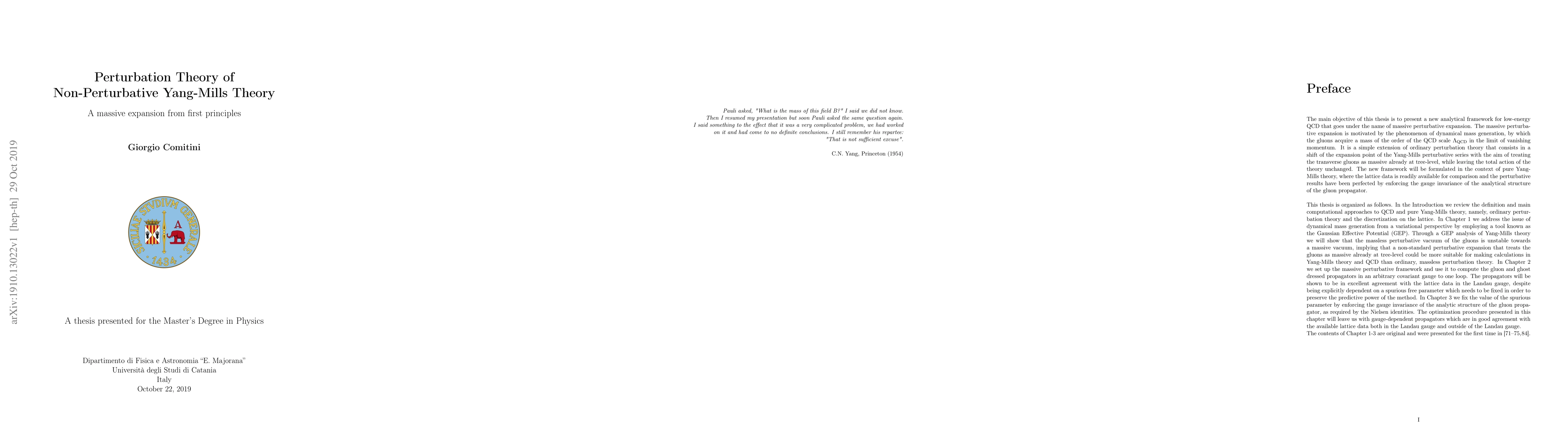The main objective of this thesis is to present a new analytical framework for low-energy QCD that goes under the name of massive, or "screened", perturbative expansion. The massive perturbative expansion is motivated by the phenomenon of dynamical mass generation, by which the gluons acquire a mass of the order of the QCD scale $\Lambda_{\text{QCD}}$ in the limit of vanishing momentum. It is a simple extension of ordinary perturbation theory that consists in a shift of the expansion point of the Yang-Mills perturbative series with the aim of treating the transverse gluons as massive already at tree-level, while leaving the total action of the theory unchanged. The new framework will be formulated in the context of pure Yang-Mills theory, where the lattice data is readily available for comparison and the perturbative results have been perfected by enforcing the gauge invariance of the analytical structure of the gluon propagator.