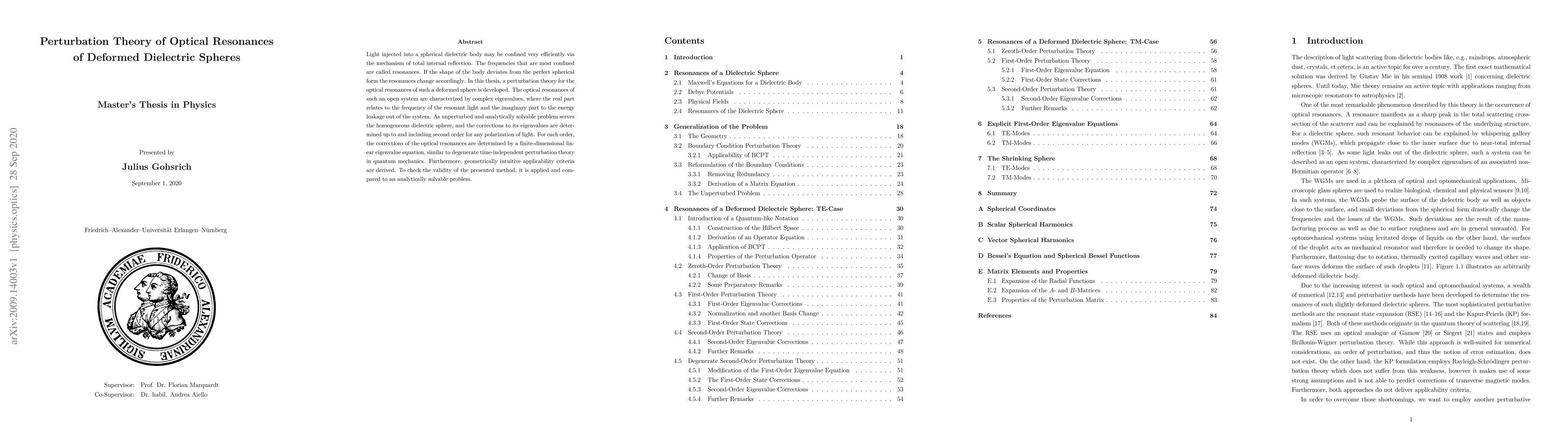 The paper introduces a perturbation theory approach for deformed dielectric spheres, providing a systematic method to calculate optical resonance corrections.