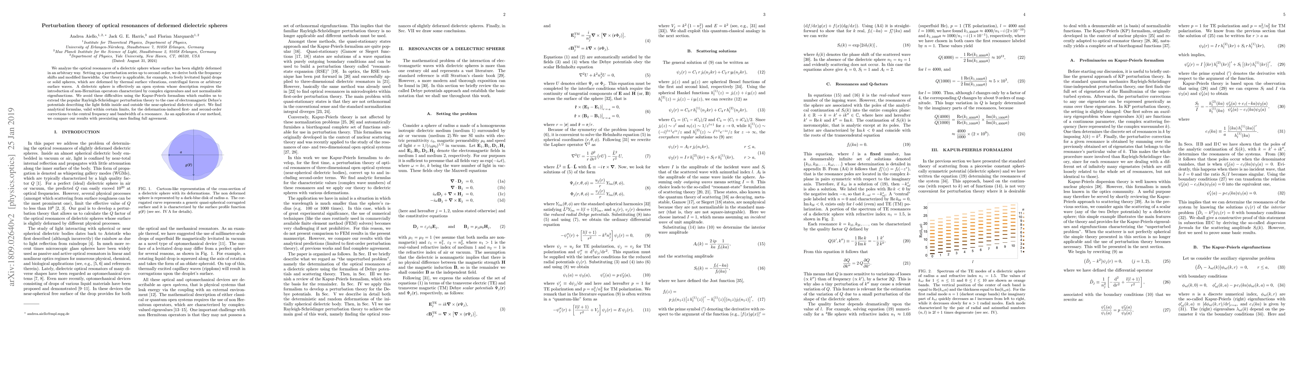This paper develops a perturbation theory to analyze the optical resonances of slightly deformed dielectric spheres, deriving analytical formulas for frequency shifts and modified linewidths. The Kapur-Peierls formalism is used to handle the complexities of non-Hermitian operators, providing a method applicable to various deformed objects like liquid drops or solid spheres.