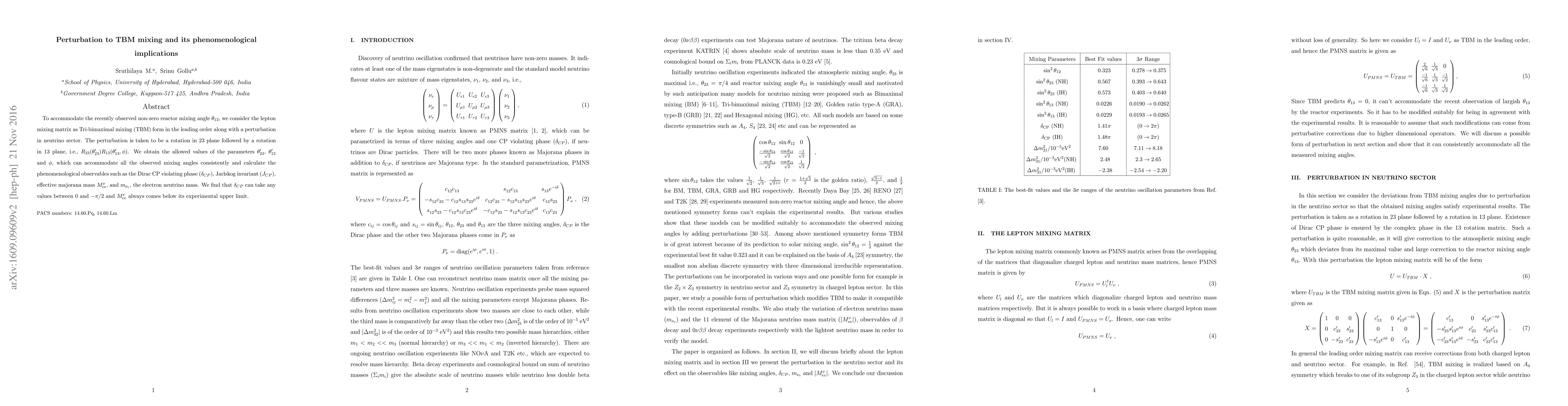 To accommodate the recently observed non-zero reactor mixing angle $\theta_{13}$, we consider the lepton mixing matrix as Tri-bimaximal mixing (TBM) form in the leading order along with a perturbation in neutrino sector. The perturbation is taken to be a rotation in 23 plane followed by a rotation in 13 plane, i.e., $R_{23}(\theta_{23}')R_{13}(\theta_{13}',\phi)$. We obtain the allowed values of the parameters $\theta_{23}'$, $\theta_{13}'$ and $\phi$, which can accommodate all the observed mixing angles consistently and calculate the phenomenological observables such as the Dirac CP violating phase ($\delta_{CP}$), Jarlskog invariant ($J_{CP}$), effective majorana mass $M_{ee}^{\nu}$, and $m_{\nu_e}$, the electron neutrino mass. We find that $\delta_{CP}$ can take any values between $0$ and $-\pi/2$ and $M_{ee}^{\nu}$ always comes below its experimental upper limit.
