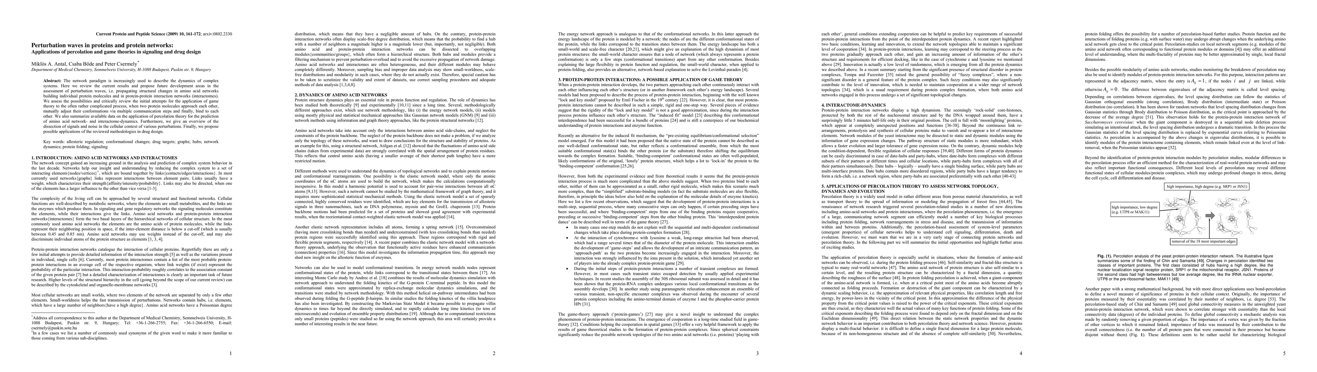 This paper reviews current research on perturbation waves in proteins and protein networks using percolation and game theories for signaling and drug design. It proposes future development areas and applications of these methodologies in predicting amino acid network dynamics and designing new drugs.