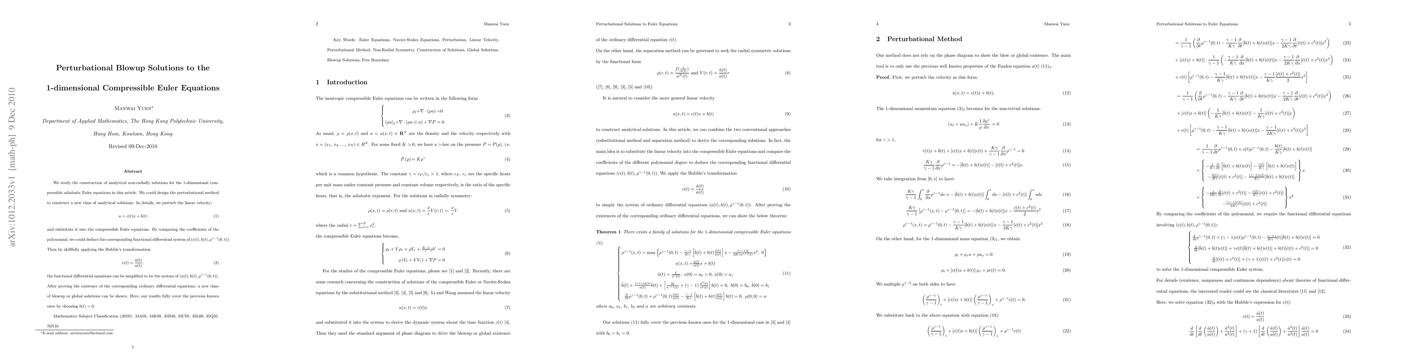 We study the construction of analytical non-radially solutions for the 1-dimensional compressible adiabatic Euler equations in this article. We could design the perturbational method to construct a new class of analytical solutions. In details, we perturb the linear velocity:% \begin{equation} u=c(t)x+b(t) \end{equation} and substitute it into the compressible Euler equations. By comparing the coefficients of the polynomial, we could deduce the corresponding functional differential system of $(c(t),b(t),\rho^{\gamma-1}(0,t)).$ Then by skillfully applying the Hubble's transformation: \begin{equation} c(t)=\frac{\dot{a}(t)}{a(t)}, \end{equation} the functional differential equations can be simplified to be the system of $(a(t),b(t),\rho^{\gamma-1}(0,t))$. After proving the existence of the corresponding ordinary differential equations, a new class of blowup or global solutions can be shown. Here, our results fully cover the previous known ones by choosing $b(t)=0$.