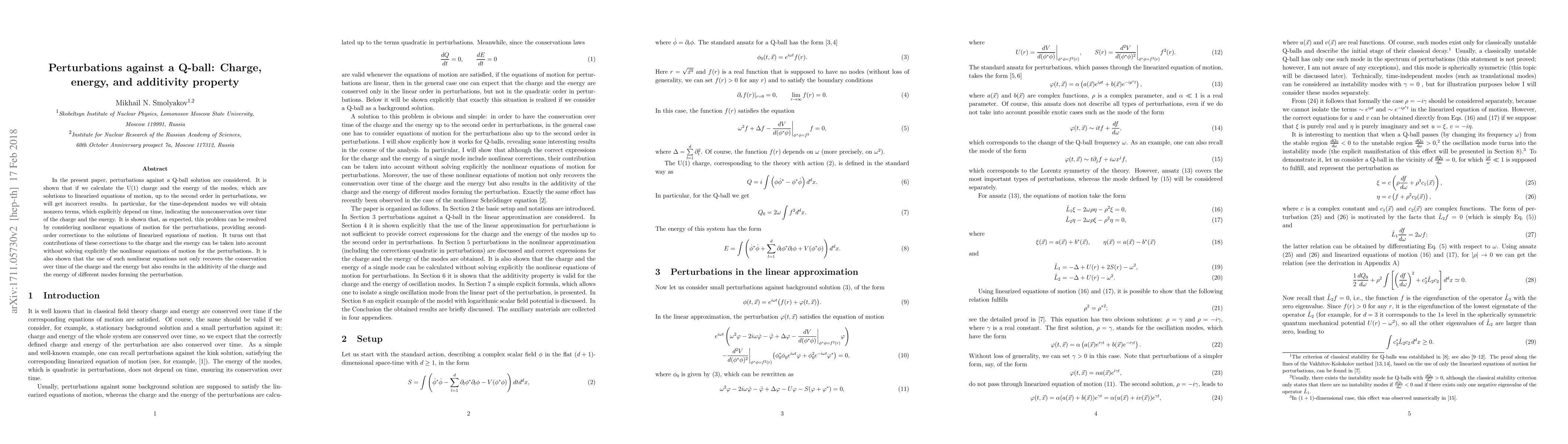 In the present paper, perturbations against a Q-ball solution are considered. It is shown that if we calculate the U(1) charge and the energy of the modes, which are solutions to linearized equations of motion, up to the second order in perturbations, we will get incorrect results. In particular, for the time-dependent modes we will obtain nonzero terms, which explicitly depend on time, indicating the nonconservation over time of the charge and the energy. It is shown that, as expected, this problem can be resolved by considering nonlinear equations of motion for the perturbations, providing second-order corrections to the solutions of linearized equations of motion. It turns out that contributions of these corrections to the charge and the energy can be taken into account without solving explicitly the nonlinear equations of motion for the perturbations. It is also shown that the use of such nonlinear equations not only recovers the conservation over time of the charge and the energy but also results in the additivity of the charge and the energy of different modes forming the perturbation.