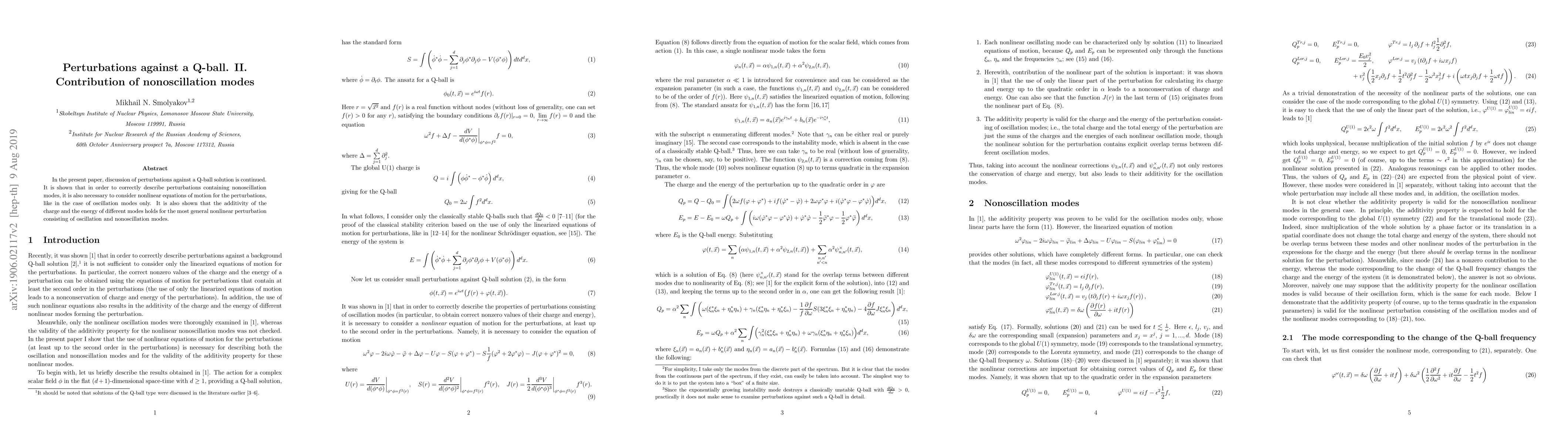 In the present paper, discussion of perturbations against a Q-ball solution is continued. It is shown that in order to correctly describe perturbations containing nonoscillation modes, it is also necessary to consider nonlinear equations of motion for the perturbations, like in the case of oscillation modes only. It is also shown that the additivity of the charge and the energy of different modes holds for the most general nonlinear perturbation consisting of oscillation and nonoscillation modes.