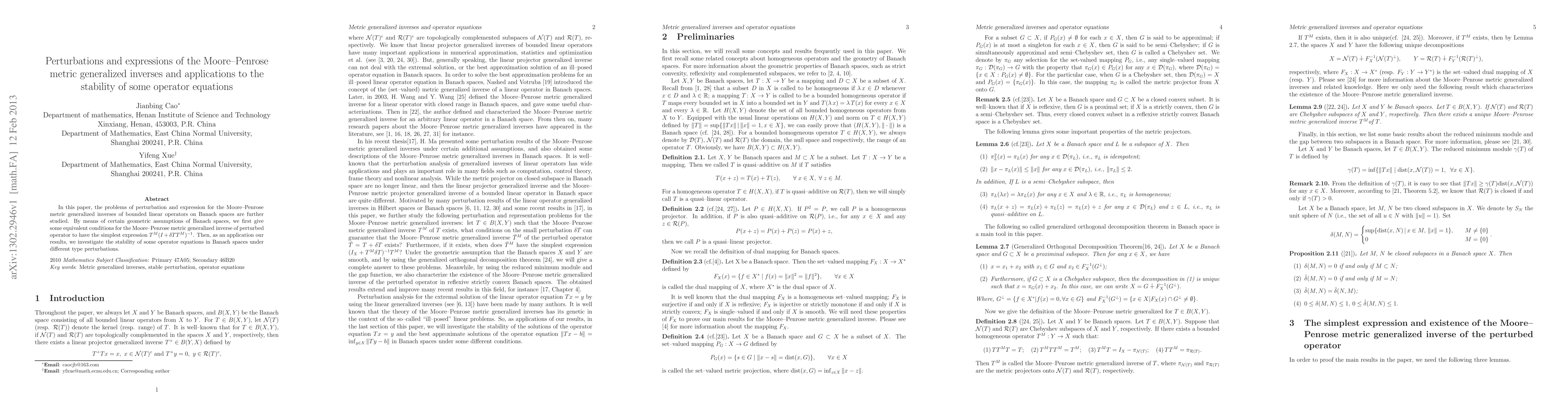 This paper explores perturbations and expressions of the Moore-Penrose metric generalized inverses for bounded linear operators in Banach spaces, providing equivalent conditions for simplified expressions. It further investigates the stability of operator equations under various perturbations using these results.