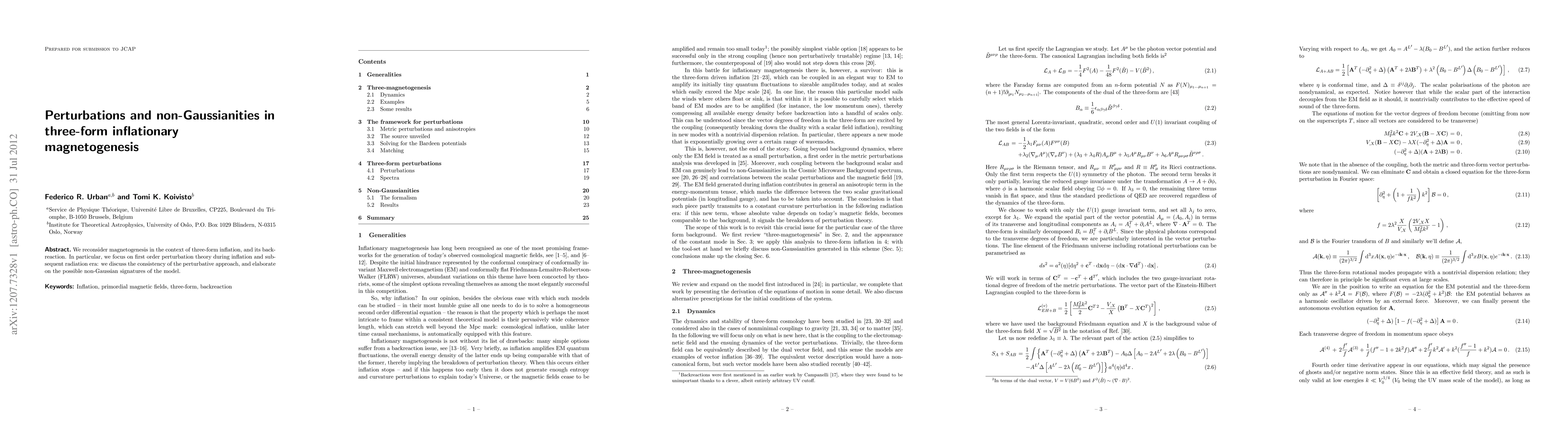 We reconsider magnetogenesis in the context of three-form inflation, and its backreaction. In particular, we focus on first order perturbation theory during inflation and subsequent radiation era: we discuss the consistency of the perturbative approach, and elaborate on the possible non-Gaussian signatures of the model.