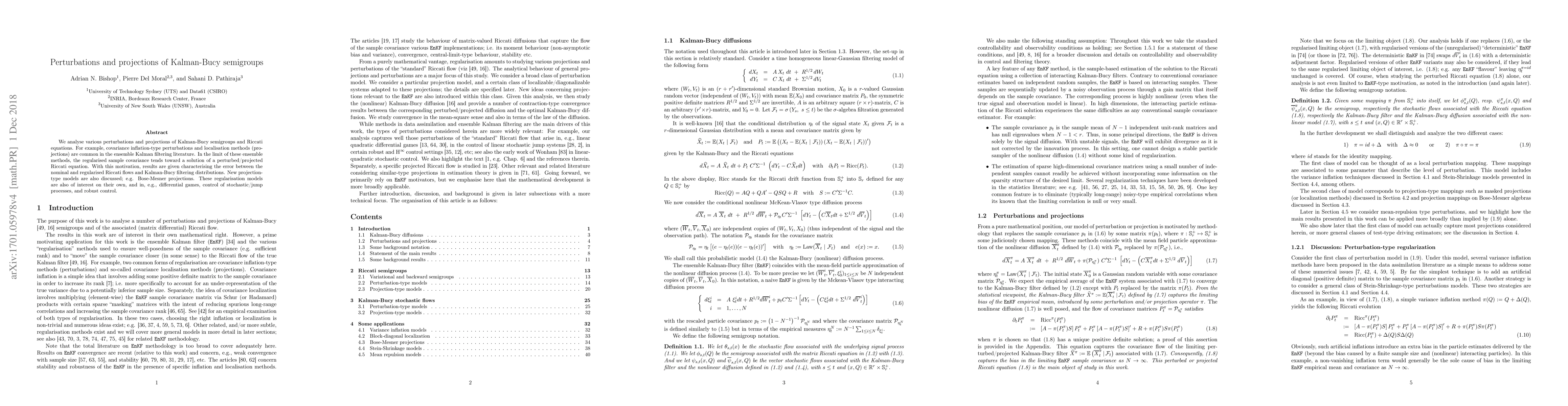 This paper investigates perturbations and projections of Kalman-Bucy semigroups and Riccati equations, focusing on covariance inflation and localization methods in ensemble Kalman filtering. It characterizes the error between nominal and regularized Riccati flows, and discusses new projection-type models like Bose-Mesner projections, relevant in differential games, stochastic control, and robust control.