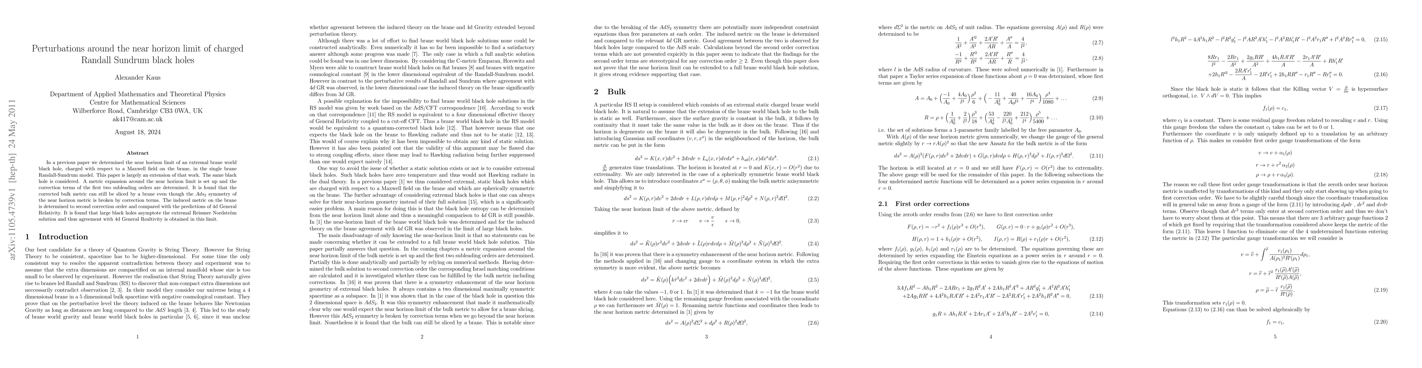 In a previous paper we determined the near horizon limit of an extremal brane world black hole, charged with respect to a Maxwell field on the brane, in the single brane Randall-Sundrum model. This paper is largely an extension of that work. The same black hole is considered. A metric expansion around the near horizon limit is set up and the correction terms of the first two subleading orders are determined. It is found that the corrected bulk metric can still be sliced by a brane even though the $Ads_{2}$ symmetry of the near horizon metric is broken by correction terms. The induced metric on the brane is determined to second correction order and compared with the predictions of 4d General Relativity. It is found that large black holes asymptote the extremal Reissner Nordstr\"om solution and thus agreement with 4d General Realtivity is obtained in this limit.