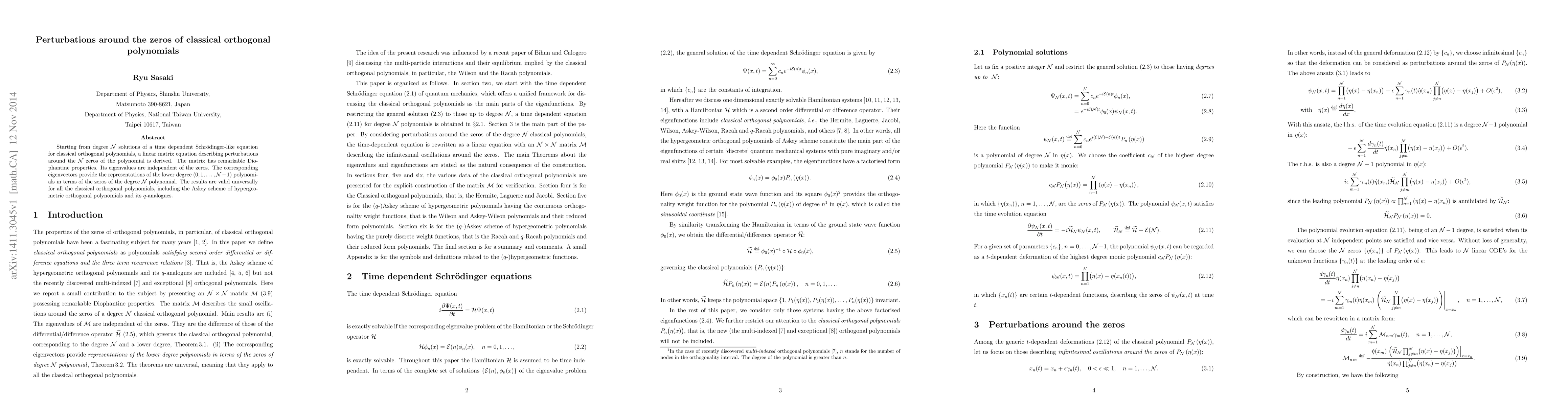 Starting from degree N solutions of a time dependent Schroedinger-like equation for classical orthogonal polynomials, a linear matrix equation describing perturbations around the N zeros of the polynomial is derived. The matrix has remarkable Diophantine properties. Its eigenvalues are independent of the zeros. The corresponding eigenvectors provide the representations of the lower degree (0,1,...,N-1) polynomials in terms of the zeros of the degree N polynomial. The results are valid universally for all the classical orthogonal polynomials, including the Askey scheme of hypergeometric orthogonal polynomials and its q-analogues.