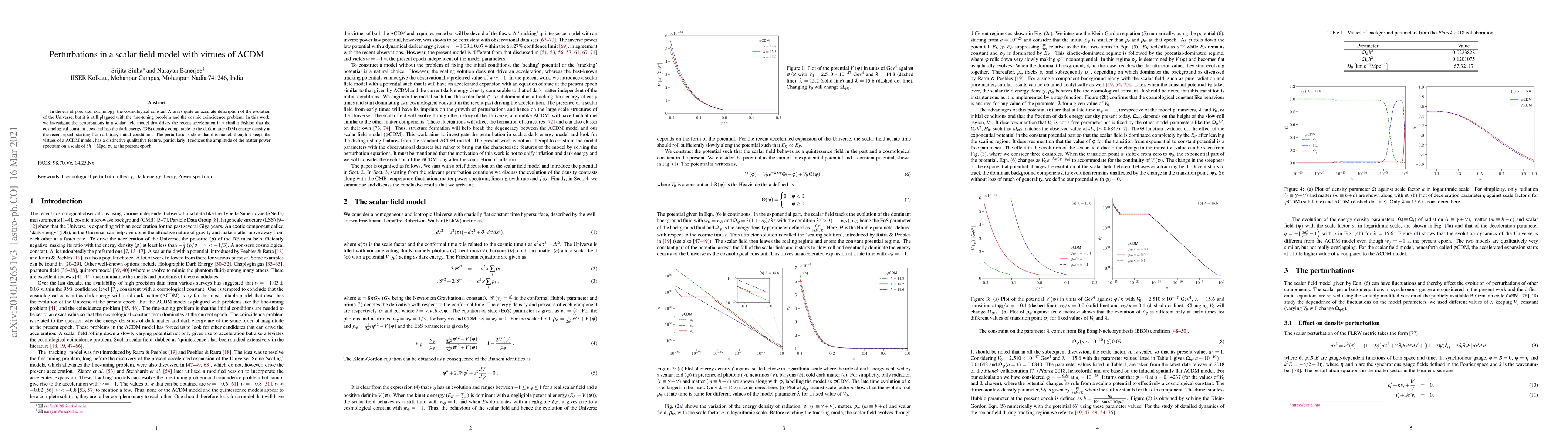 In the era of precision cosmology, the cosmological constant $\Lambda$ gives quite an accurate description of the evolution of the Universe, but it is still plagued with the fine-tuning problem and the cosmic coincidence problem. In this work, we investigate the perturbations in a scalar field model that drives the recent acceleration in a similar fashion that the cosmological constant does and has the dark energy (DE) density comparable to the dark matter (DM) energy density at the recent epoch starting from arbitrary initial conditions. The perturbations show that this model, though it keeps the virtues of a $\Lambda$CDM model, has a distinctive qualitative feature, particularly it reduces the amplitude of the matter power spectrum on a scale of $8 h^{-1}\, \mbox{Mpc}$, $\sigma_{8}$ at the present epoch.