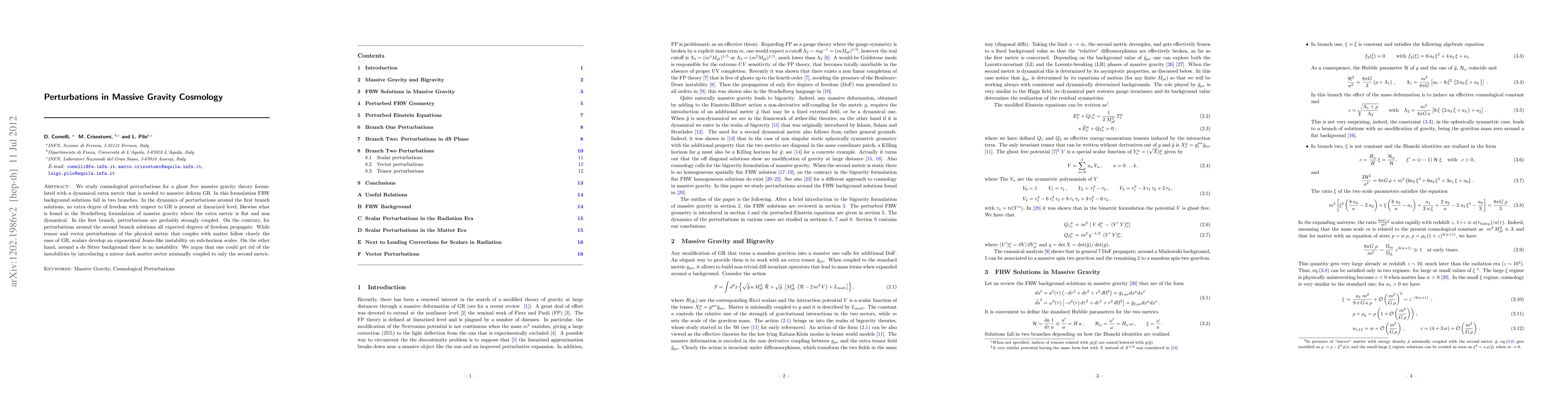 We study cosmological perturbations for a ghost free massive gravity theory formulated with a dynamical extra metric that is needed to massive deform GR. In this formulation FRW background solutions fall in two branches. In the dynamics of perturbations around the first branch solutions, no extra degree of freedom with respect to GR ispresent at linearized level, likewise what is found in the Stuckelberg formulation of massive gravity where the extra metric isflat and non dynamical. In the first branch, perturbations are probably strongly coupled. On the contrary, for perturbations around the second branch solutions all expected degrees of freedom propagate. While tensor and vector perturbations of the physical metric that couples with matter follow closely the ones of GR, scalars develop an exponential Jeans-like instability on sub-horizon scales. On the other hand, around a de Sitter background there is no instability. We argue that one could get rid of the instabilities by introducing a mirror dark matter sector minimally coupled to only the second metric.
