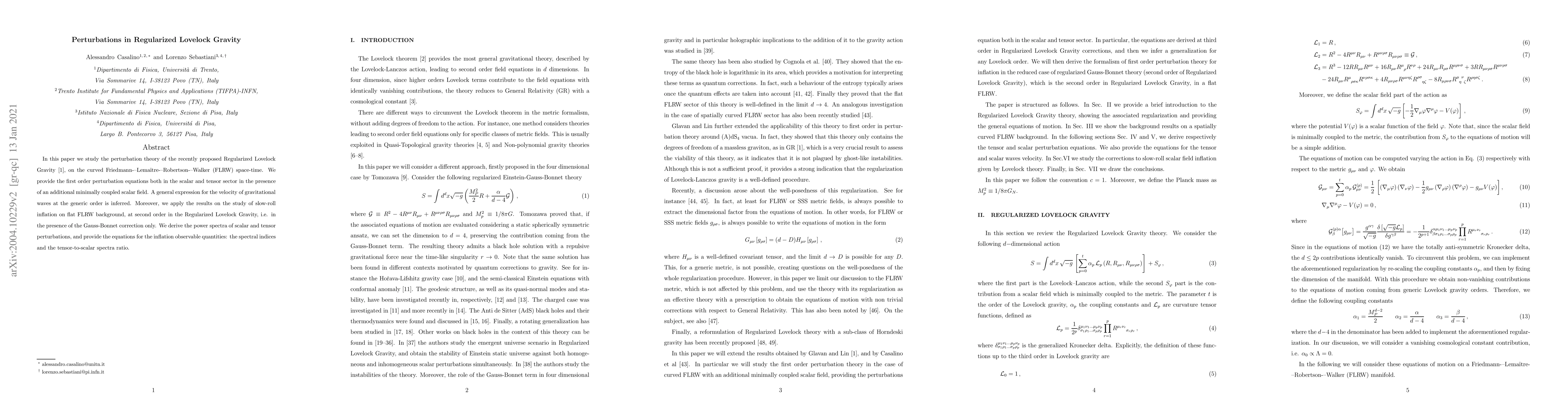 In this paper we study the perturbation theory of the recently proposed Regularized Lovelock Gravity, on the curved FLRW space-time. We provide the first order perturbation equations both in the scalar and tensor sector in the presence of an additional minimally coupled scalar field. A general expression for the velocity of gravitational waves at the generic order is inferred. Moreover, we apply the results on the study of slow-roll inflation on flat FLRW background, at second order in the Regularized Lovelock Gravity, i.e. in the presence of the Gauss-Bonnet correction only. We derive the power spectra of scalar and tensor perturbations, and provide the equations for the inflation observable quantities: the spectral indices and the tensor-to-scalar spectra ratio.