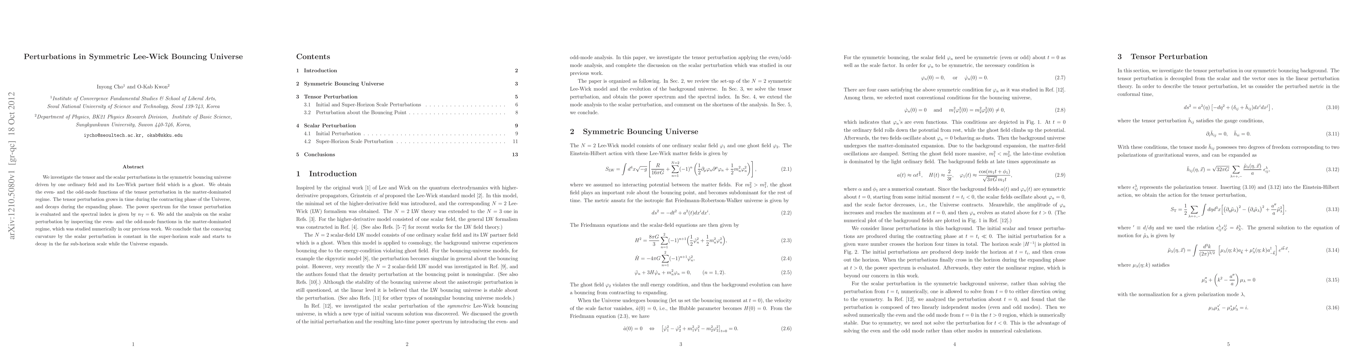 We investigate the tensor and the scalar perturbations in the symmetric bouncing universe driven by one ordinary field and its Lee-Wick partner field which is a ghost. We obtain the even- and the odd-mode functions of the tensor perturbation in the matter-dominated regime. The tensor perturbation grows in time during the contracting phase of the Universe, and decays during the expanding phase. The power spectrum for the tensor perturbation is evaluated and the spectral index is given by $n_{\rm T} =6$. We add the analysis on the scalar perturbation by inspecting the even- and the odd-mode functions in the matter-dominated regime, which was studied numerically in our previous work. We conclude that the comoving curvature by the scalar perturbation is constant in the super-horizon scale and starts to decay in the far sub-horizon scale while the Universe expands.