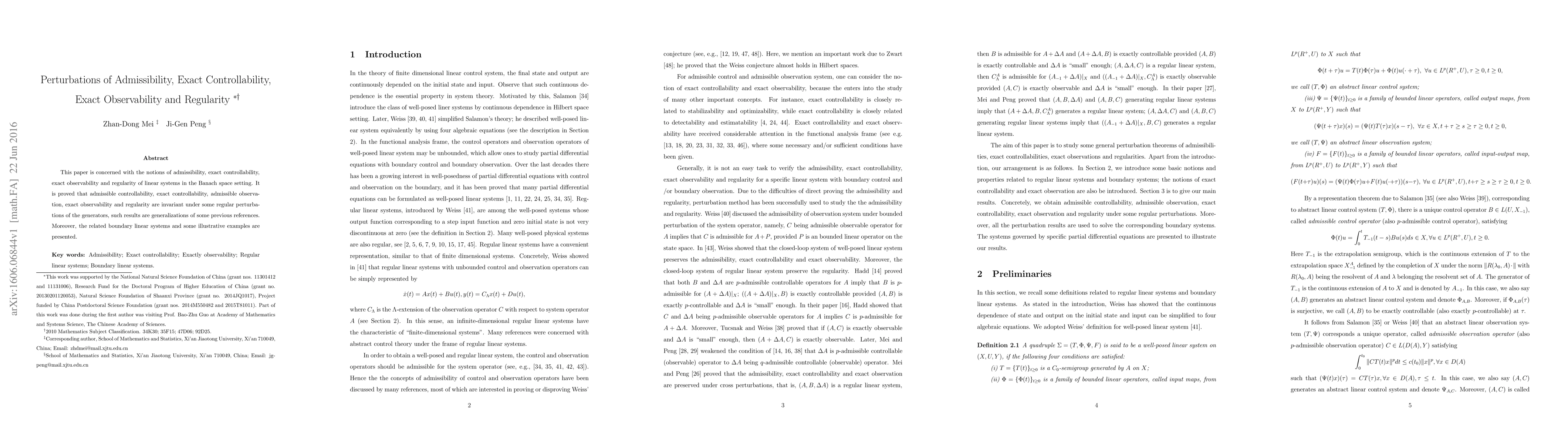 This paper investigates the properties of admissibility, exact controllability, exact observability, and regularity in linear systems within Banach spaces. It demonstrates that these properties remain invariant under certain regular perturbations, extending previous results and including boundary linear systems with examples.