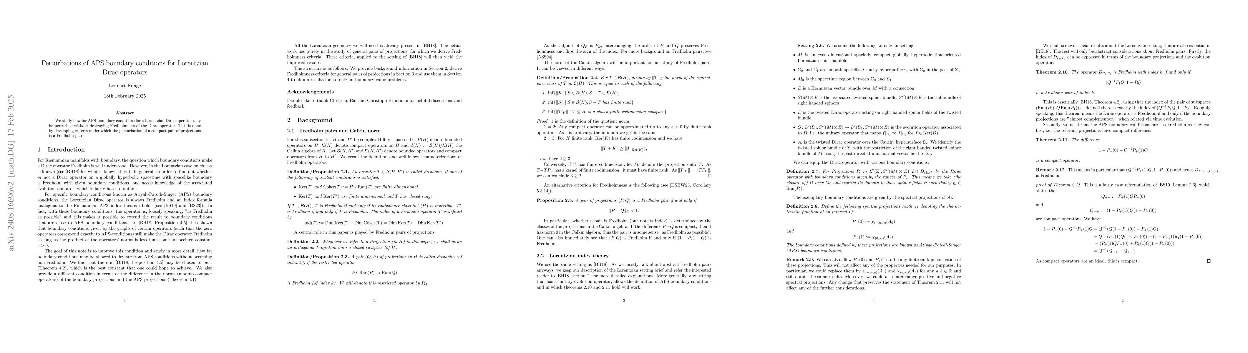 Summary: This paper investigates the allowable perturbations of Atiyah-Patodi-Singer (APS) boundary conditions for Lorentzian Dirac operators to maintain the Fredholm property. It establishes criteria for when a compact pair of projections can be perturbed while preserving Fredholmness.