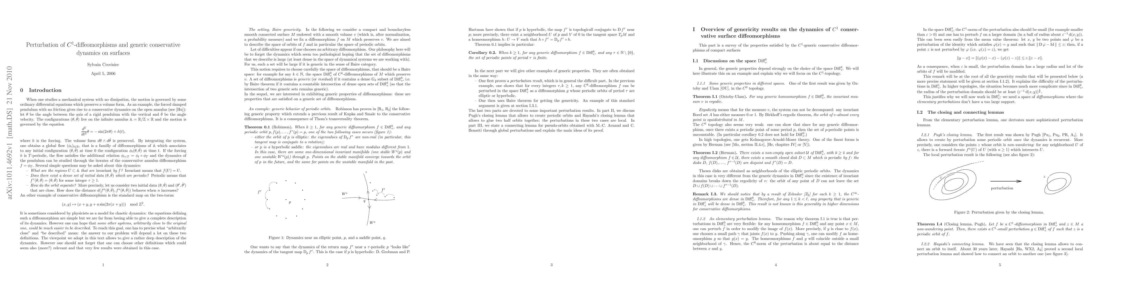In the first part of this text we give a survey of the properties satisfied by the C1-generic conservative diffeomorphisms of compact surfaces. The main result that we will discuss is that a C1-generic conservative diffeomorphism of a connected compact surface is transitive. It is obtain as a consequence of a connecting lemma for pseudo-orbits. In the last parts we expose some recent developments of the C1-perturbation technics and the proof of this connecting lemma. We are not aimed to deal with technicalities nor to give the finest available versions of these results. Besides this theory exists also in higher dimension and in the non-conservative setting, we restricted the scope of this presentation to the conservative case on surfaces, since it offers some simplifications which allow to explain in an easier way the main ideas of the subject.