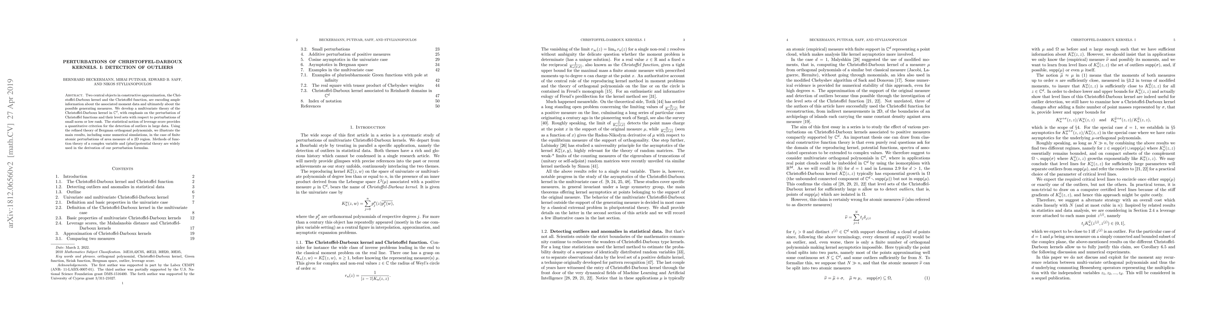 Two central objects in constructive approximation, the Christoffel-Darboux kernel and the Christoffel function, are encoding ample information about the associated moment data and ultimately about the possible generating measures. We develop a multivariate theory of the Christoffel-Darboux kernel in C^d, with emphasis on the perturbation of Christoffel functions and their level sets with respect to perturbations of small norm or low rank. The statistical notion of leverage score provides a quantitative criterion for the detection of outliers in large data. Using the refined theory of Bergman orthogonal polynomials, we illustrate the main results, including some numerical simulations, in the case of finite atomic perturbations of area measure of a 2D region. Methods of function theory of a complex variable and (pluri)potential theory are widely used in the derivation of our perturbation formulas.