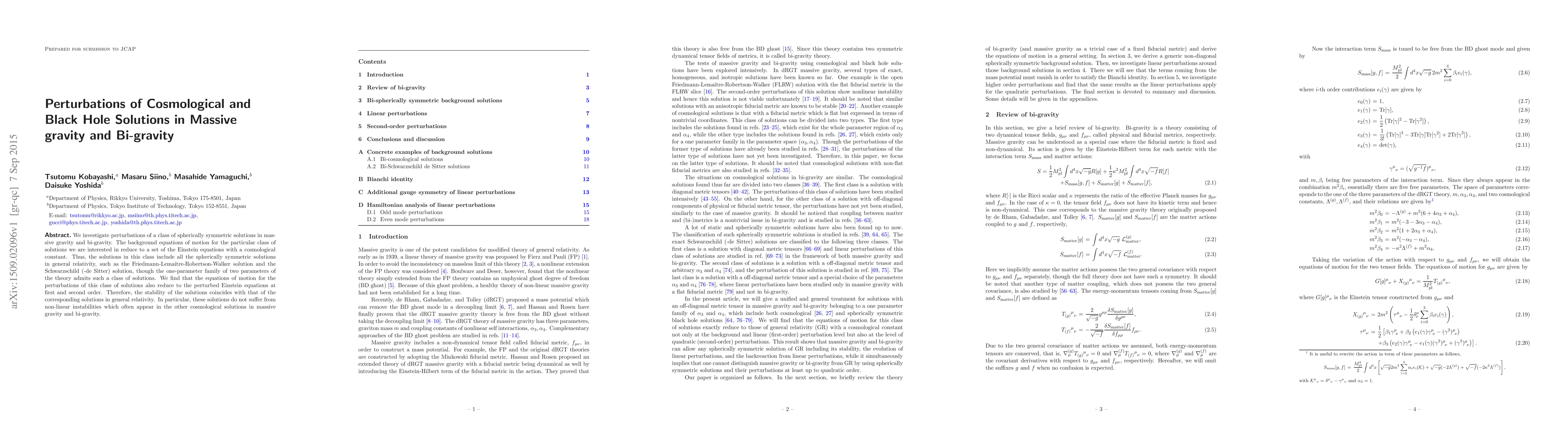 This paper studies perturbations in spherically symmetric solutions of massive gravity and bi-gravity, finding that their stability matches that of general relativity, with no non-linear instabilities observed in other cosmological solutions. The background solutions include the Friedmann-Lemaître-Robertson-Walker and Schwarzschild (-de Sitter) models.