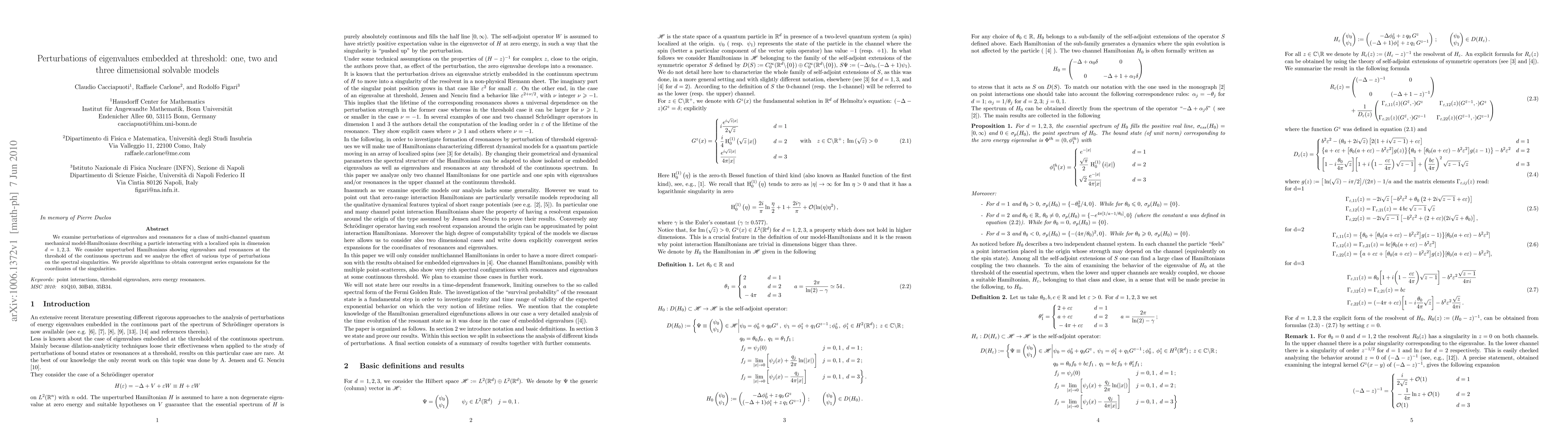 We examine perturbations of eigenvalues and resonances for a class of multi-channel quantum mechanical model-Hamiltonians describing a particle interacting with a localized spin in dimension $d=1,2,3$. We consider unperturbed Hamiltonians showing eigenvalues and resonances at the threshold of the continuous spectrum and we analyze the effect of various type of perturbations on the spectral singularities. We provide algorithms to obtain convergent series expansions for the coordinates of the singularities.