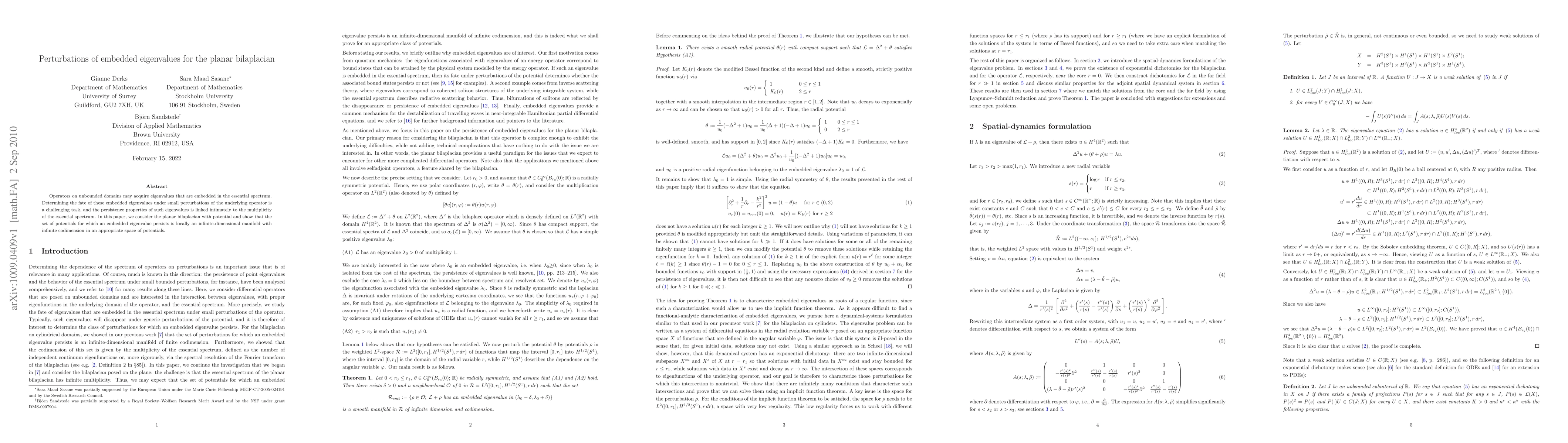 Operators on unbounded domains may acquire eigenvalues that are embedded in the essential spectrum. Determining the fate of these embedded eigenvalues under small perturbations of the underlying operator is a challenging task, and the persistence properties of such eigenvalues is linked intimately to the multiplicity of the essential spectrum. In this paper, we consider the planar bilaplacian with potential and show that the set of potentials for which an embedded eigenvalue persists is locally an infinite-dimensional manifold with infinite codimension in an appropriate space of potentials.