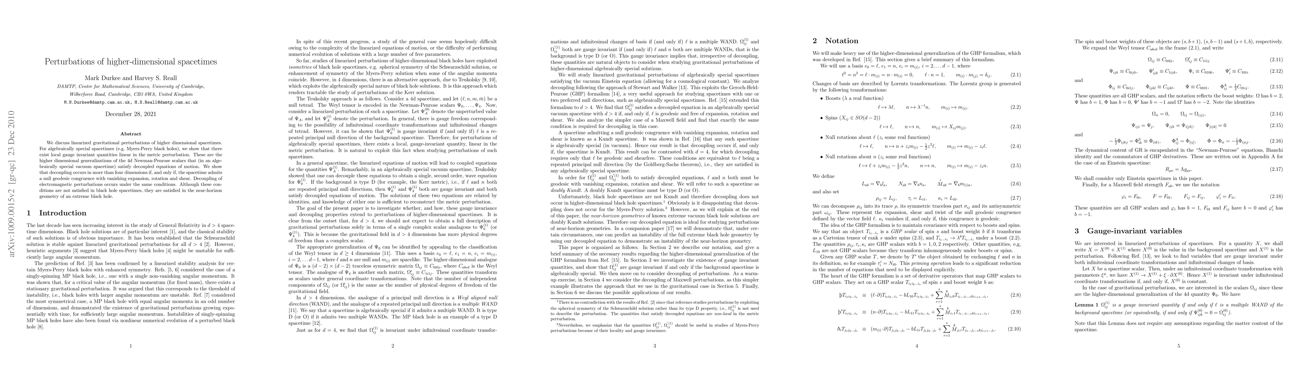 We discuss linearized gravitational perturbations of higher dimensional spacetimes. For algebraically special spacetimes (e.g. Myers-Perry black holes), we show that there exist local gauge invariant quantities linear in the metric perturbation. These are the higher dimensional generalizations of the 4d Newman-Penrose scalars that (in an algebraically special vacuum spacetime) satisfy decoupled equations of motion. We show that decoupling occurs in more than four dimensions if, and only if, the spacetime admits a null geodesic congruence with vanishing expansion, rotation and shear. Decoupling of electromagnetic perturbations occurs under the same conditions. Although these conditions are not satisfied in black hole spacetimes, they are satisfied in the near-horizon geometry of an extreme black hole.