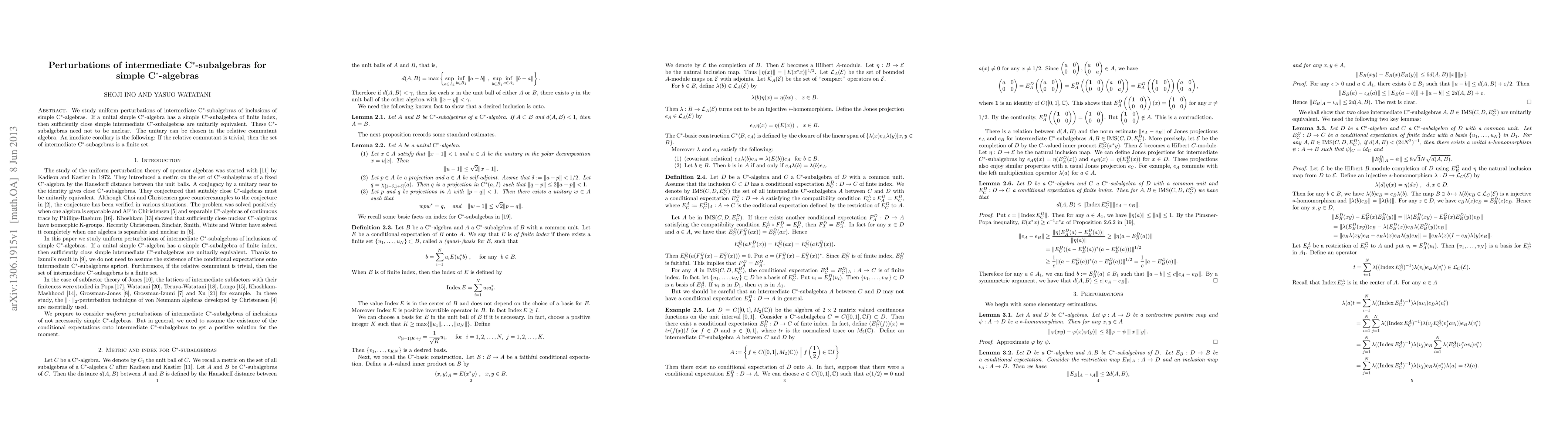 This paper investigates uniform perturbations of intermediate C*-subalgebras within simple C*-algebras, proving that sufficiently close simple intermediate C*-subalgebras are unitarily equivalent when the algebra has a simple C*-subalgebra of finite index. The unitary equivalence can be found in the relative commutant algebra, and if the relative commutant is trivial, the set of intermediate C*-subalgebras is finite.