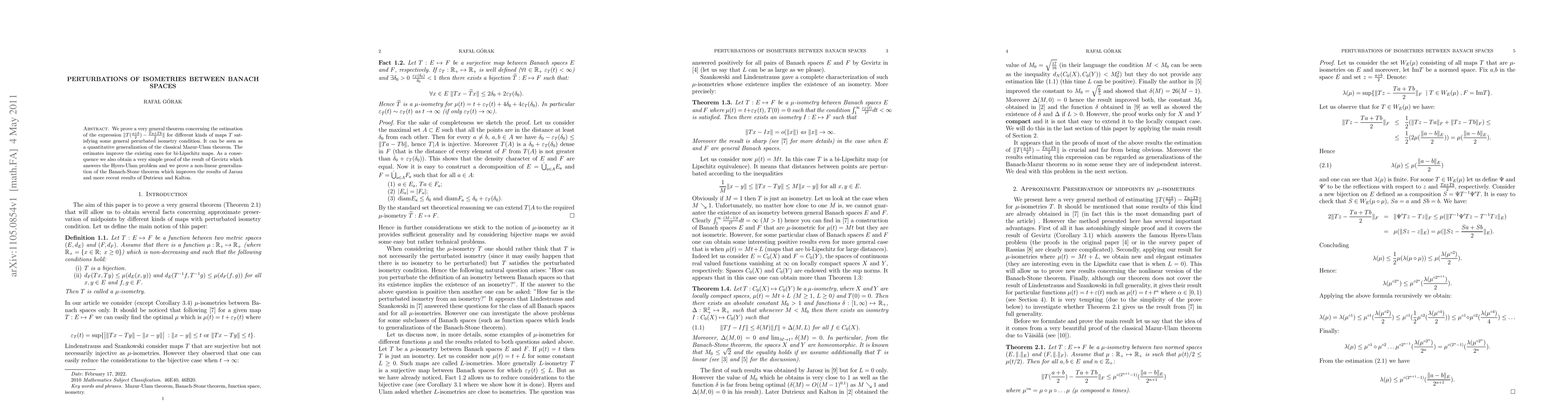 We prove a very general theorem concerning the estimation of the expression $\|T(\frac{a+b}{2}) - \frac{Ta+Tb}{2}\|$ for different kinds of maps $T$ satisfying some general perurbated isometry condition. It can be seen as a quantitative generalization of the classical Mazur-Ulam theorem. The estimates improve the existing ones for bi-Lipschitz maps. As a consequence we also obtain a very simple proof of the result of Gevirtz which answers the Hyers-Ulam problem and we prove a non-linear generalization of the Banach-Stone theorem which improves the results of Jarosz and more recent results of Dutrieux and Kalton.