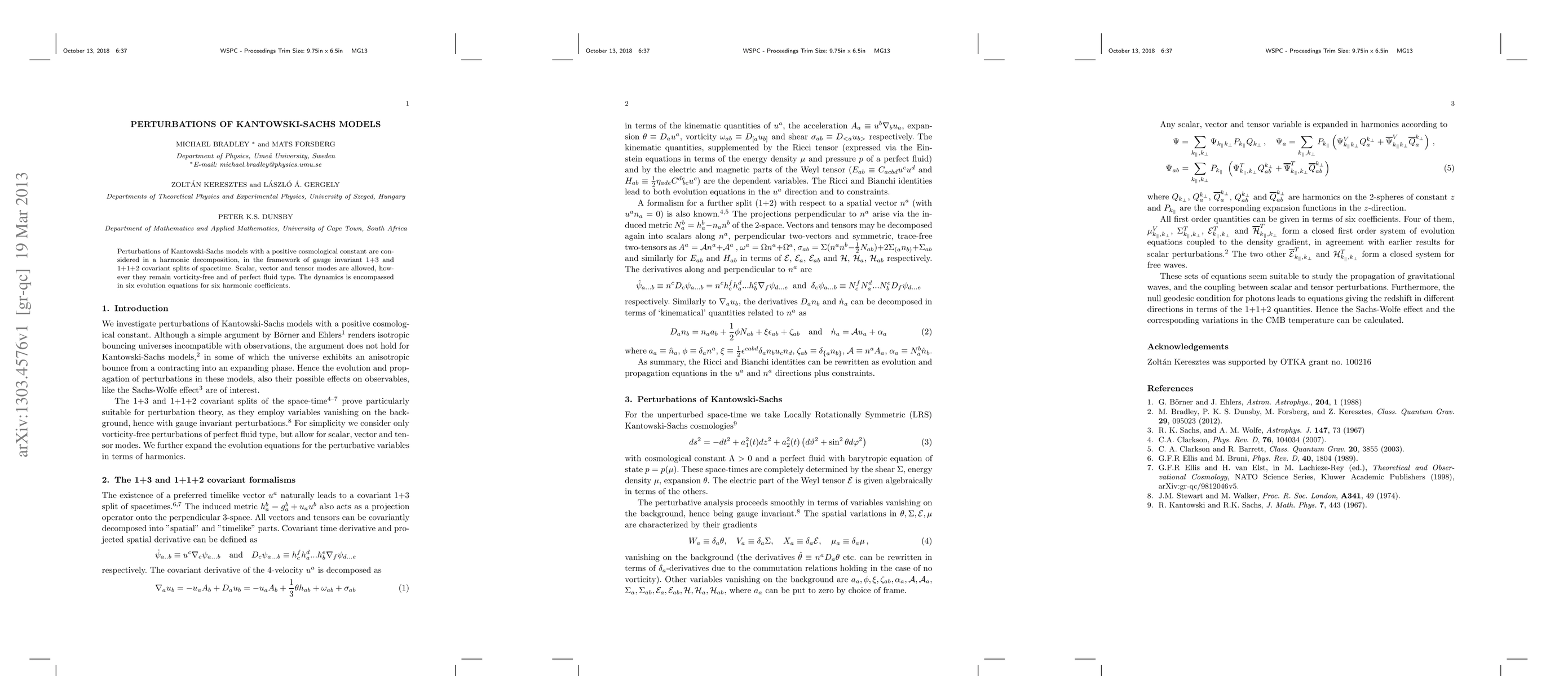 This paper investigates perturbations of Kantowski-Sachs models with a positive cosmological constant, employing harmonic decomposition and gauge invariant splits of spacetime to study scalar, vector, and tensor modes, focusing on perfect fluid dynamics and deriving six evolution equations for harmonic coefficients.