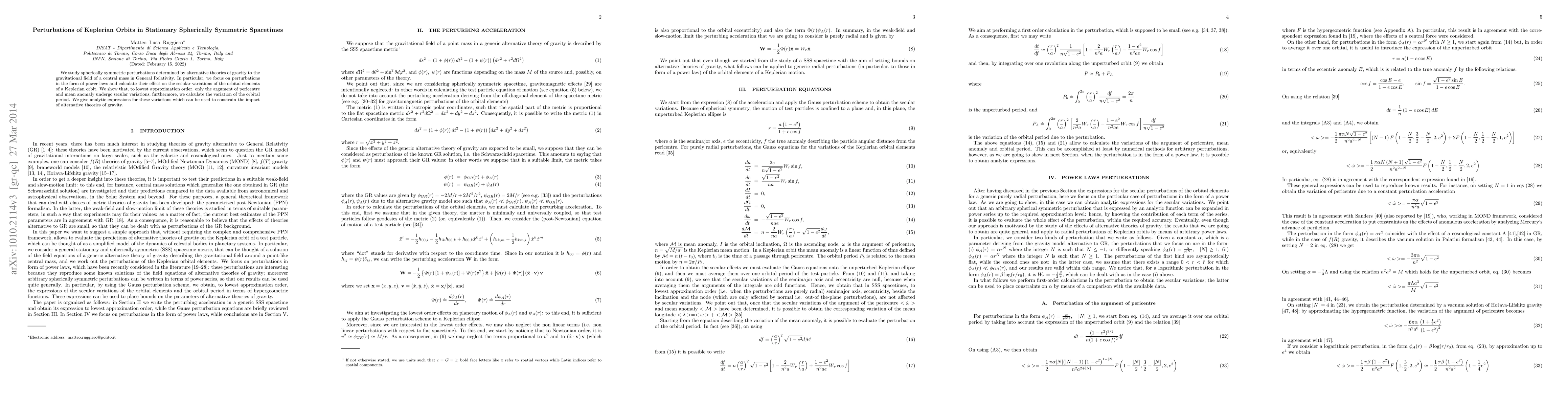 This paper investigates how alternative theories of gravity introduce spherically symmetric perturbations to the gravitational field of a central mass, focusing on power-law forms. It reveals that these perturbations primarily affect the argument of pericentre and mean anomaly of Keplerian orbits, providing analytic expressions for these variations to constrain the influence of alternative gravity theories.