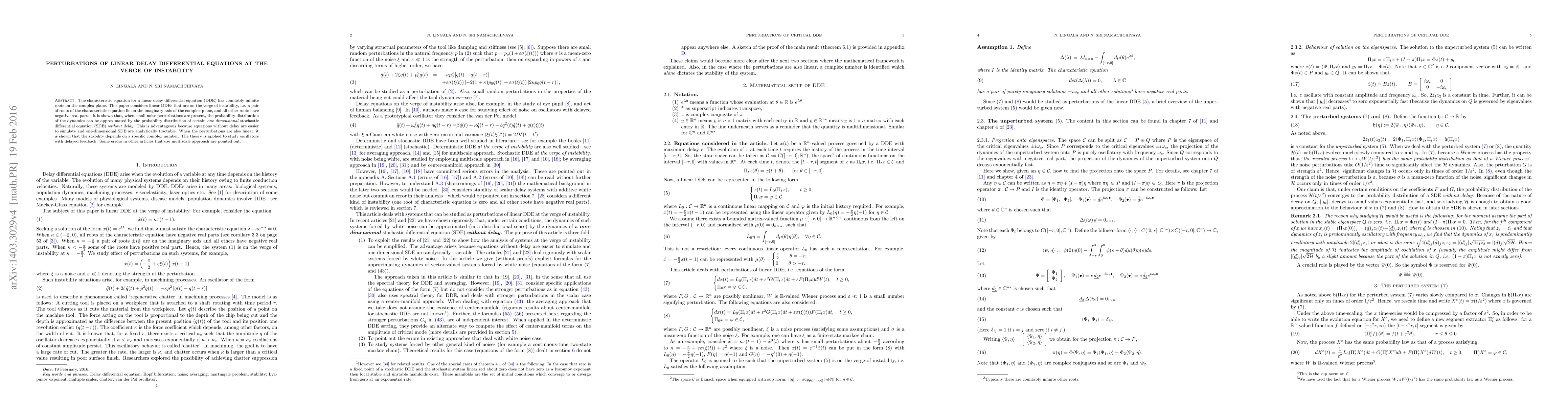 This paper investigates linear delay differential equations (DDEs) near instability, demonstrating that small noise perturbations can be approximated by a one-dimensional stochastic differential equation (SDE) without delay, simplifying analysis and simulation. It also reveals that linear perturbations' stability depends on a specific complex number, and corrects errors in previous multiscale approaches.