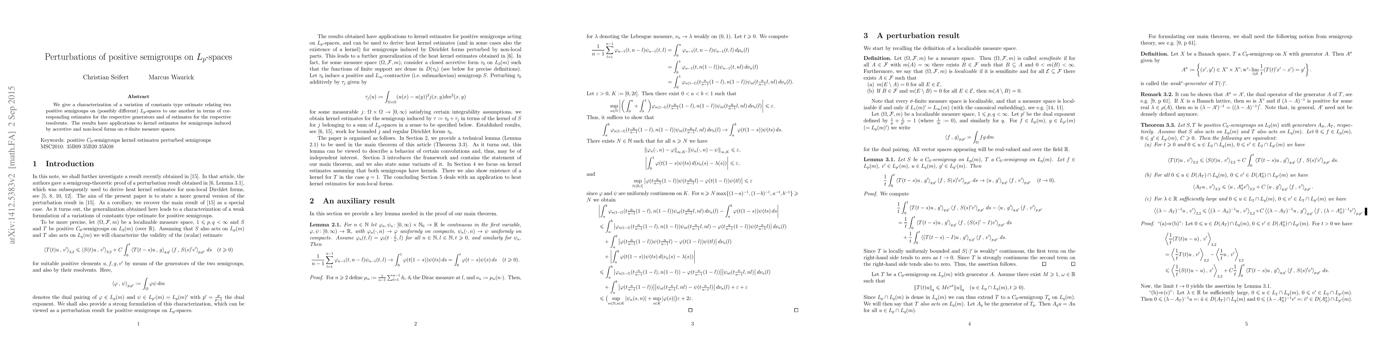 We give a characterization of a variation of constants type estimate relating two positive semigroups on (possibly different) $L_p$-spaces to one another in terms of corresponding estimates for the respective generators and of estimates for the respective resolvents. The results have applications to kernel estimates for semigroups induced by accretive and non-local forms on $\sigma$-finite measure spaces.