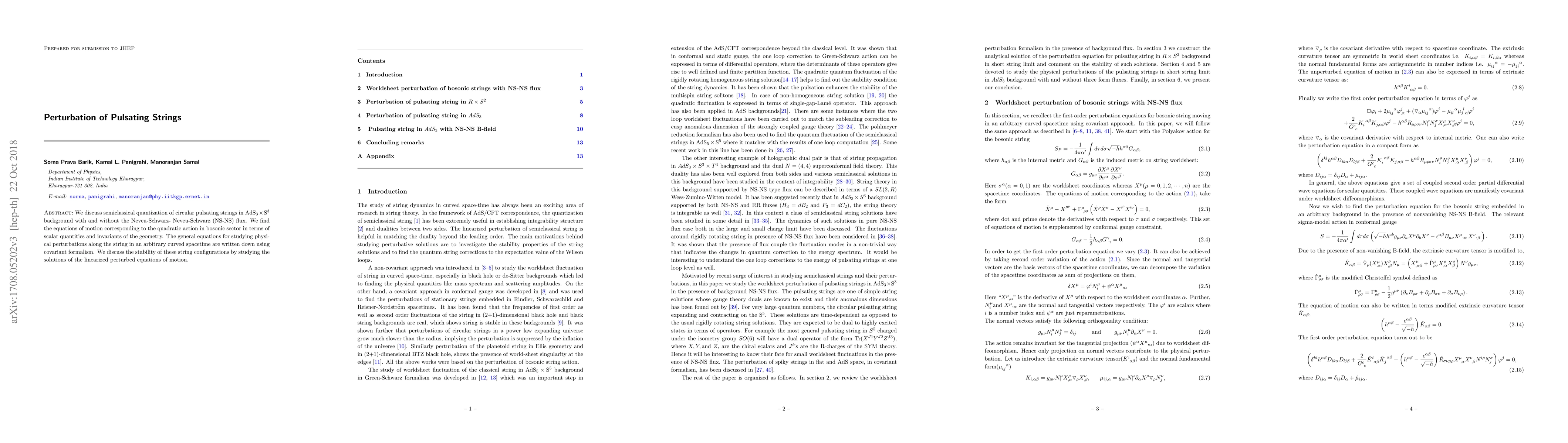 We discuss semiclassical quantization of circular pulsating strings in AdS3 x S3 background with and without the Neveu-Schwarz- Neveu-Schwarz (NS-NS) flux. We find the equations of motion corresponding to the quadratic action in bosonic sector in terms of scalar quantities and invariants of the geometry. The general equations for studying physical perturbations along the string in an arbitrary curved spacetime are written down using covariant formalism. We discuss the stability of these string configurations by studying the solutions of the linearized perturbed equations of motion.