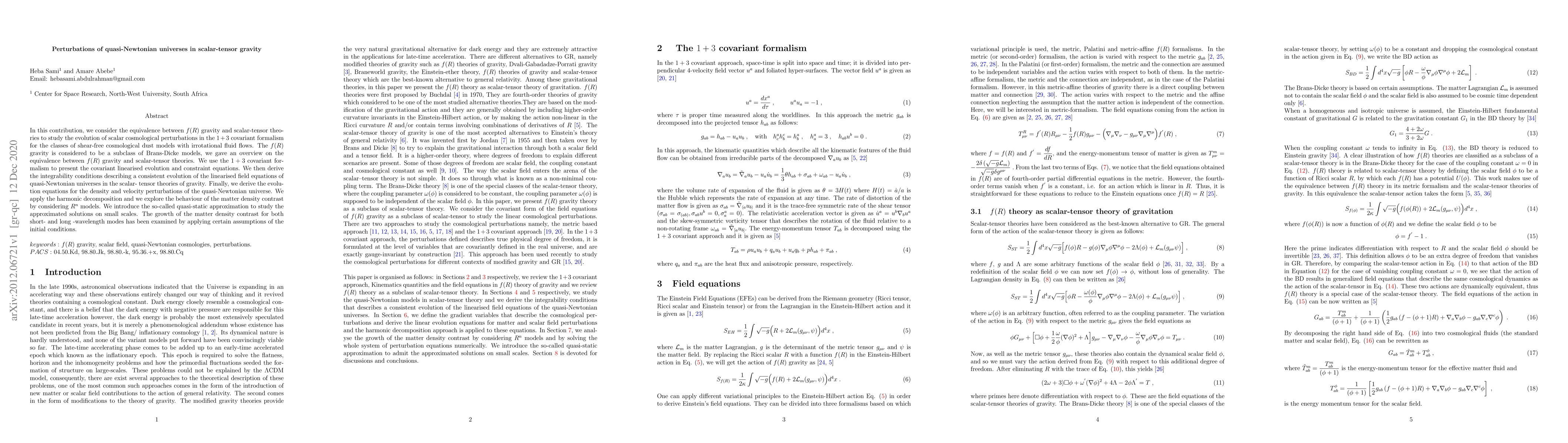 In this contribution, we consider the equivalence between $f(R)$ gravity and scalar-tensor theories to study the evolution of scalar cosmological perturbations in the $1 + 3$ covariant formalism for the classes of shear-free cosmological dust models with irrotational fluid flows. The $f(R)$ gravity is considered to be a subclass of Brans-Dicke models, we gave an overview on the equivalence between $f(R)$ gravity and scalar-tensor theories. We use the $1 + 3$ covariant formalism to present the covariant linearised evolution and constraint equations. We then derive the integrability conditions describing a consistent evolution of the linearised field equations of quasi-Newtonian universes in the scalar-tensor theories of gravity. Finally, we derive the evolution equations for the density and velocity perturbations of the quasi-Newtonian universe. We apply the harmonic decomposition and we explore the behaviour of the matter density contrast by considering $R^{n}$ models. We introduce the so-called quasi-static approximation to study the approximated solutions on small scales. The growth of the matter density contrast for both short- and long- wavelength modes has been examined by applying certain assumptions of the initial conditions.