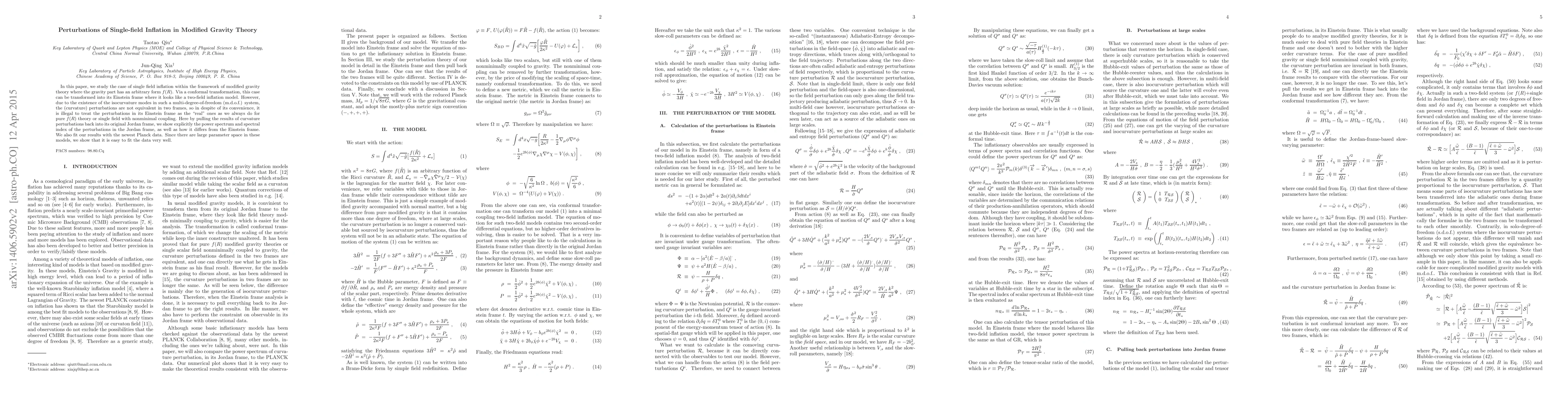 Researchers investigate single-field inflation in modified gravity theory, finding that curvature perturbations differ between the Jordan frame and Einstein frame, but can still fit Planck data well.