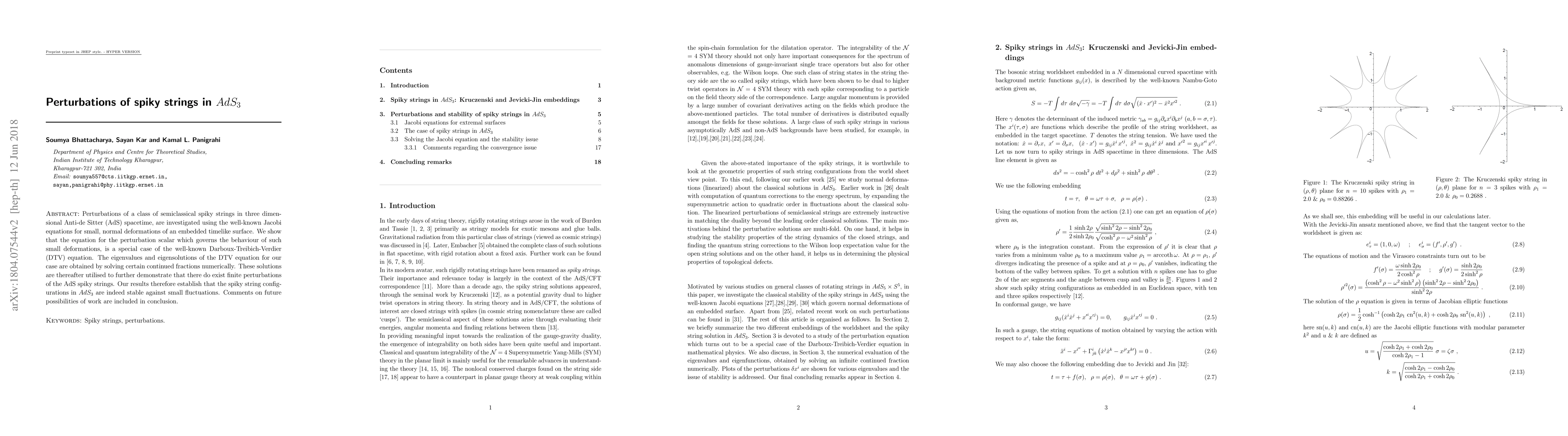 Perturbations of a class of semiclassical spiky strings in three dimensional Anti-de Sitter (AdS) spacetime, are investigated using the well-known Jacobi equations for small, normal deformations of an embedded timelike surface. We show that the equation for the perturbation scalar which governs the behaviour of such small deformations, is a special case of the well-known Darboux-Treibich-Verdier (DTV) equation. The eigenvalues and eigensolutions of the DTV equation for our case are obtained by solving certain continued fractions numerically. These solutions are thereafter utilised to further demonstrate that there do exist finite perturbations of the AdS spiky strings. Our results therefore establish that the spiky string configurations in AdS3 are indeed stable against small fluctuations. Comments on future possibilities of work are included in conclusion.