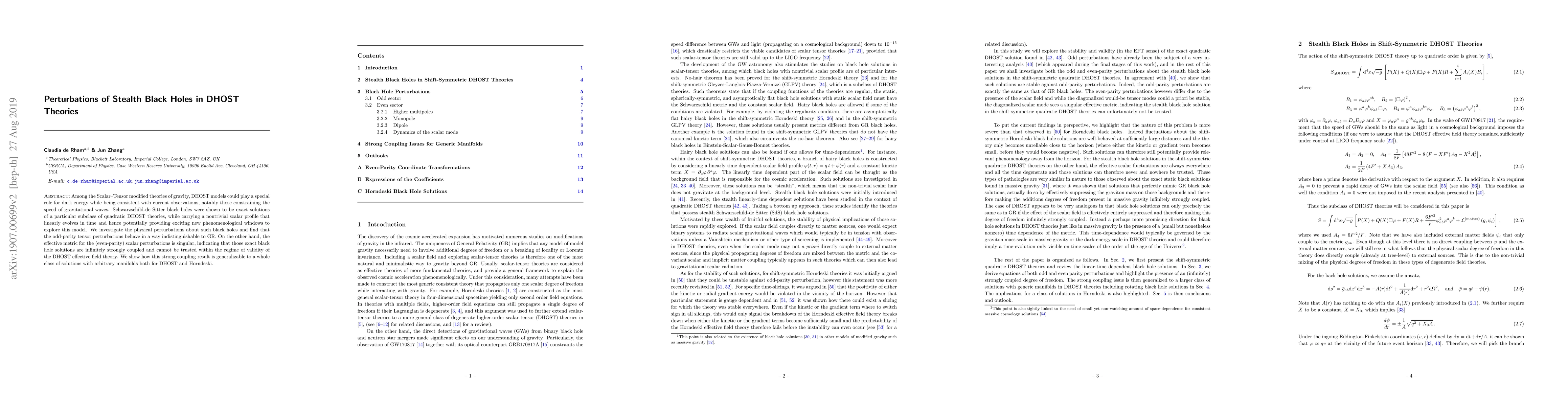 This paper explores perturbations in DHOST theories, a subclass of scalar-tensor gravity models, focusing on Schwarzschild-de Sitter black holes. It finds that odd-parity tensor perturbations behave similarly to general relativity, but even-parity scalar perturbations lead to strong coupling, invalidating the exact black hole solutions within the DHOST framework.