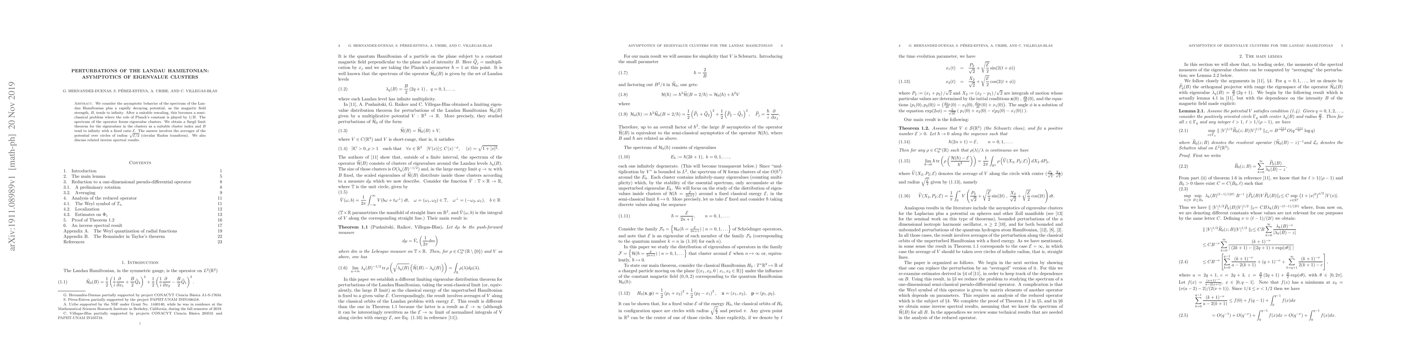 We consider the asymptotic behavior of the spectrum of the Landau Hamiltonian plus a rapidly decaying potential, as the magnetic field strength, $B$, tends to infinity. After a suitable rescaling, this becomes a semiclassical problem where the role of Planck's constant is played by $1/B$. The spectrum of the operator forms eigenvalue clusters. We obtain a Szeg\H{o} limit theorem for the eigenvalues in the clusters as a suitable cluster index and $B$ tend to infinity with a fixed ratio $\calE$. The answer involves the averages of the potential over circles of radius $\sqrt{\calE/2}$ (circular Radon transform). We also discuss related inverse spectral results.